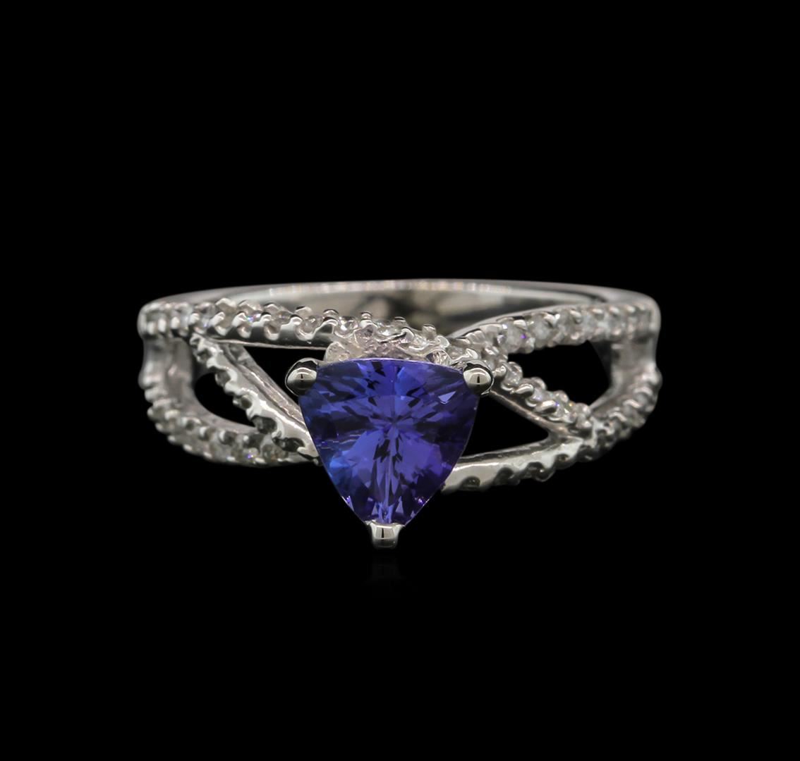 One ring featuring: 14KT white gold weighing 4.65 grams containing one prong set pyramid shape tanzanite center stone with a total weight of 1.30ct and pave set round diamonds with a total weight of 0.42ct.