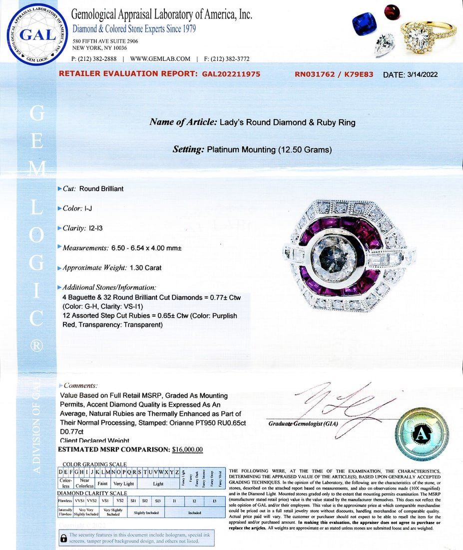 Lady's Round Diamond & Ruby Ring Setting: Platinum Mounting (12.50 Grams) Cut Round Brilliant Color: I - J Clarity: I2 to I3 Measurements: 6.50 - 6.54 x 4.00mm± Approximate Weight: 1.30 Carat AdditionalStones/Information: 4 Baguette & 32 Round Brilliant Cut Diamonds = 0.77± Ctw (Color: G - H, Clarity: VS to I1) 12 Assorted Step Cut Rubies = 0.65± Ctw (Color: Purplish Red, Transparency: Transparent)