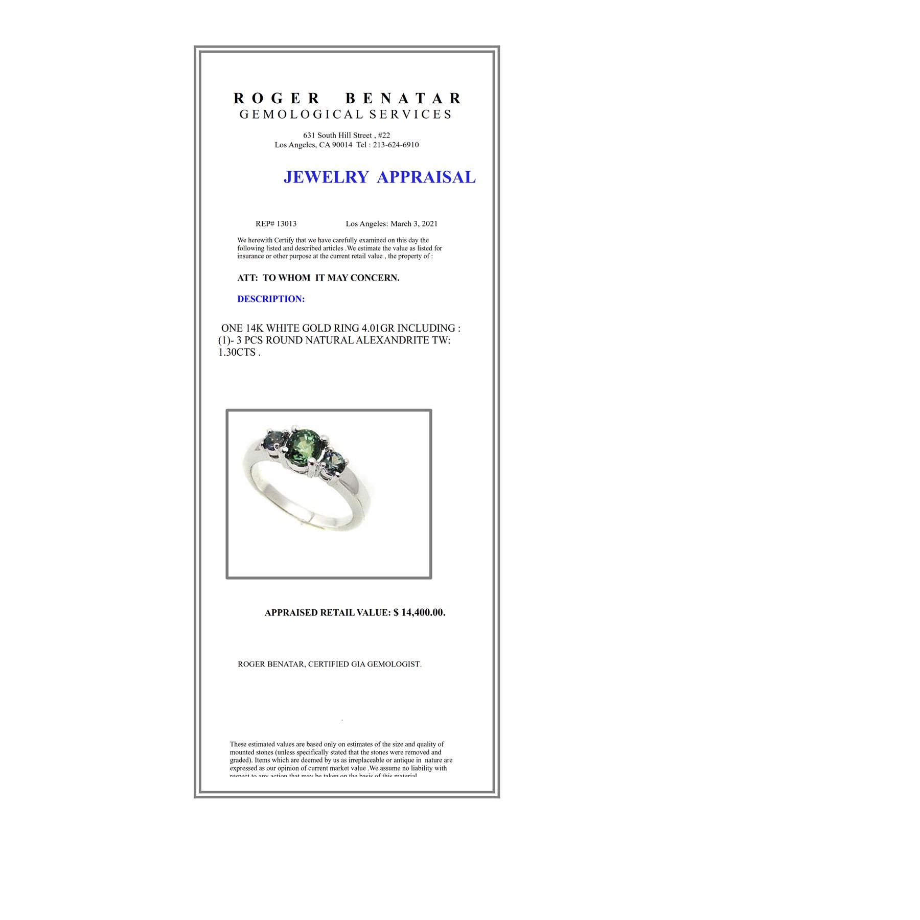 14K WHITE GOLD NATURAL ALEXANDRITE RING:4.01 GRAMS/ALEXANDRITE:1.30CT/#GVR1071 **This gorgeous 1.30ct Natural Alexandrite are gemstones of high wisdom and heart energy. Flanked by gleaming duo Round Cut Natural Alexandrite and crafted in 14K white gold, this ring is an investment piece; its brilliant green hue sings out to the cosmos.**