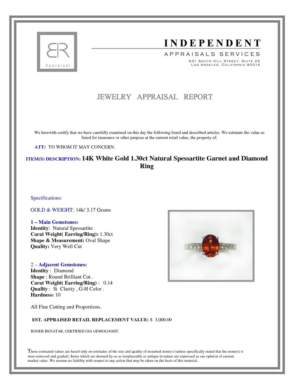 14K WHITE GOLD NATURAL SPESSARTITE RING: 3.17GRAM /SPESSARTITE :1.30CT/ DIAMOND RD :0.14CT/#GVR1233 **Regally crafted in 14K white gold, this ravishing 1.30ct Oval Shape Spessartite Garnet demands full attention. Garnet is known to encourage one to take actions towards one's dreams, visions and goals. twinkling 0.14ct Round Brilliant Cut Diamonds adorn its stepped shank, delightfully brightening the hue and capturing the eye.**