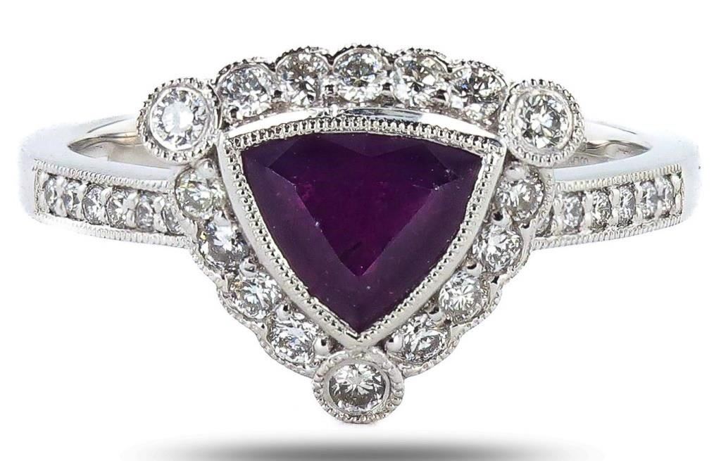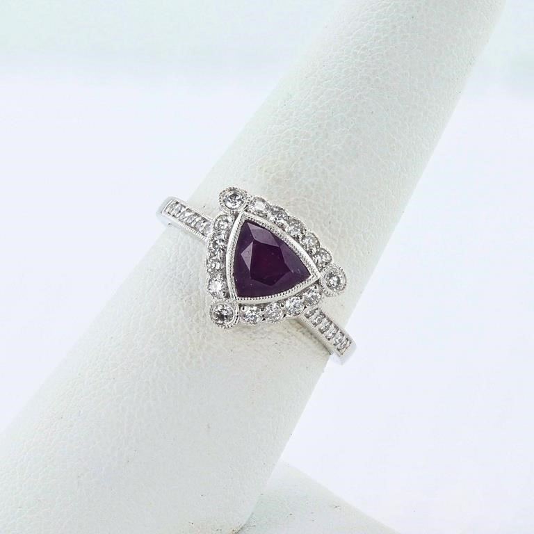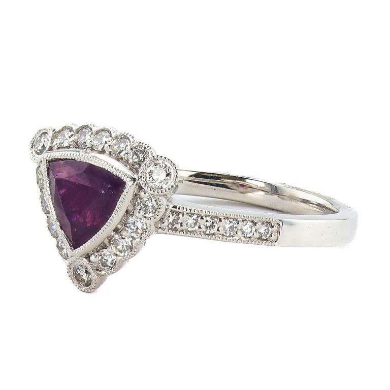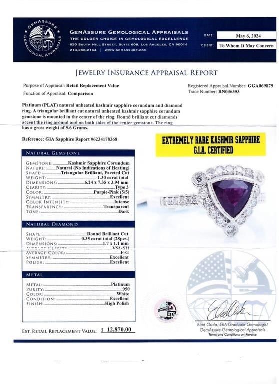 Platinum (PLAT) natural unheated kashmir sapphire corundum and diamond ring. A triangular brilliant cut natural unheated kashmir sapphire corundum gemstone is mounted in the center of the ring. Round brilliant cut diamonds accent the ring around and on both sides of the center gemstone. The ring has a gross weight of 5.6 Grams. Reference: GIA Sapphire Report 6234178368 #NATURAL GEMSTONE# GEMSTONE: Kashmir Sapphire Corundum NATURE: Natural (No Indications of Heating) SHAPE: Triangular Brilliant, Faceted Cut WEIGHT: 1.30 carat total DIMENSIONS: 6.24 x 7.35 x 3.94mm CLARITY: Type 3 COLOR: Purple-Pink (5/5) SYMMETRY: Excellent COLOR INTENSITY: Intense TRANSPARENCY: Transparent TONE: Dark #NATURAL DIAMOND# SHAPE: Round Brilliant Cut WEIGHT: 0.35 carat total (28pcs.) DIMENSIONS: 1.7 x 1.1mm AVERAGE CLARITY: VS1-SI1 AVERAGE COLOR: F-G SYMMETRY: Excellent POLISH: Excellent #METAL# METAL: Platinum PURITY: 950 COLOR: White CONDITION: Excellent FINISH: High Polish #LREF-3542