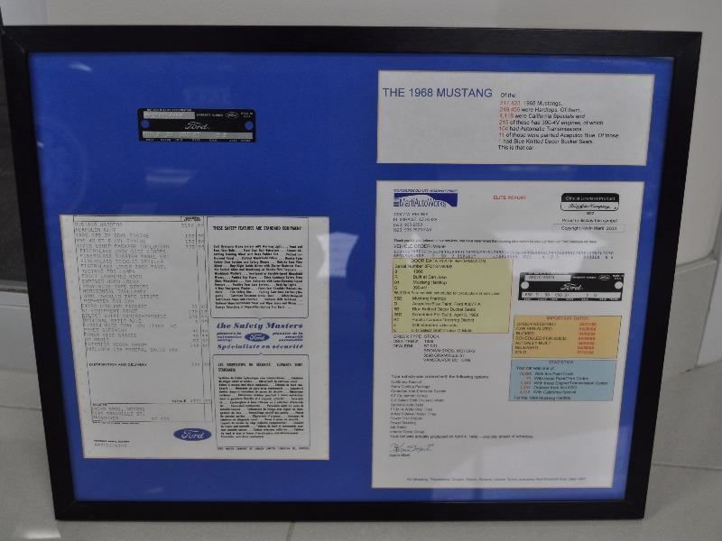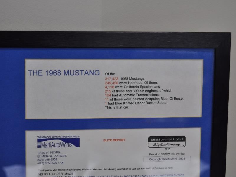 This very rare model documented GT-390 California Special Mustang is one of them and has received a rotisserie nut and bolt concours restoration. A one of one car that is finished in original form of Acapulco Blue w/Blue knitted decor bucket seat interior. It is also loaded with a long list of factory convenience options that include GT equipment group, C-6 Select shift cruise-o-matic transmission, power steering, power disc brakes, AM radio, F70x14 wide oval tires and much more. Further documentation provenance includes a deluxe Kevin Marti/Ford report with a copy of the original widow sticker and option build sheet displaying that it was delivered and sold new at Brown Brothers Ford on Granville street in Vancouver, CA. The GT/CS has become one of the most owner-appreciated classic Mustangs, since it has both the qualities of a Shelby GT, and a Mustang coupe. Its uniqueness, and rarity draws great attention on the road, and at car shows. Today, classic car collectors consider these cars to be very desirable and appreciated investments. Less than 100 test/tune break in miles. Truly a documented one of one car!!