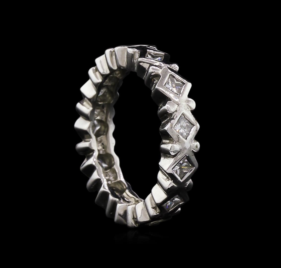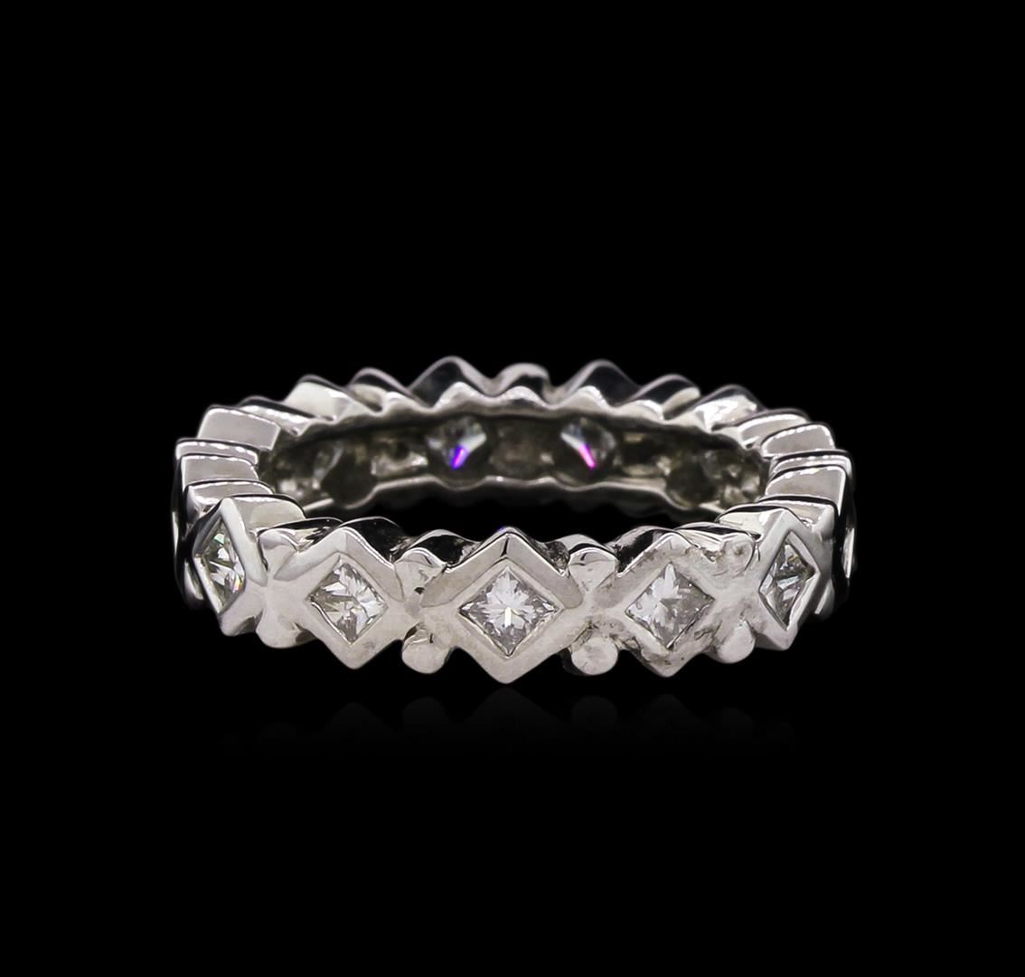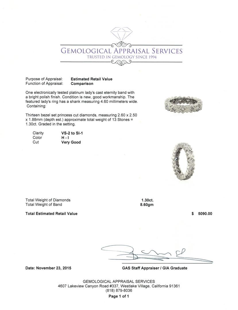 One electronically tested platinum lady's cast eternity band with a bright polish finish. The featured lady's ring has a shank measuring 4.60 millimeters wide. Condition is new, good workmanship. Containing: Thirteen bezel set princess cut diamonds, measuring 2.60 x 2.50 x 1.88mm (depth est.) approximate total weight of 13 Stones = 1.30ct. Graded in the setting. Clarity: VS-2 to SI-1. Color: H - I. Cut Very Good. Total Weight of Diamonds 1.30ct. Total Weight of Band 8.60gm. GAS Appraised at $5,090.00.