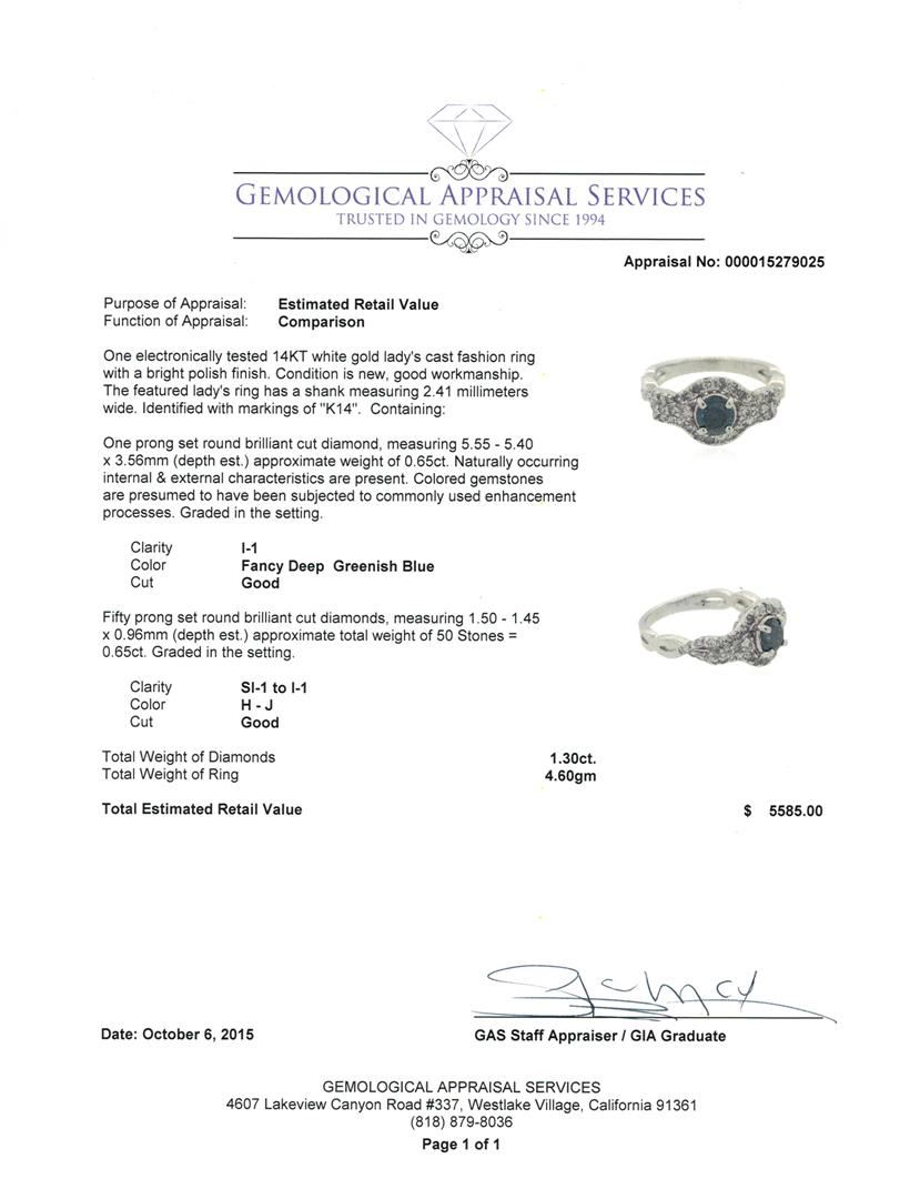 One electronically tested 14KT white gold lady's cast fashion ring with a bright polish finish. The featured lady's ring has a shank measuring 2.41 millimeters wide. Identified with markings of "K14". Condition is new, good workmanship. Containing: One pr GAS Appraised at $5,585.00.