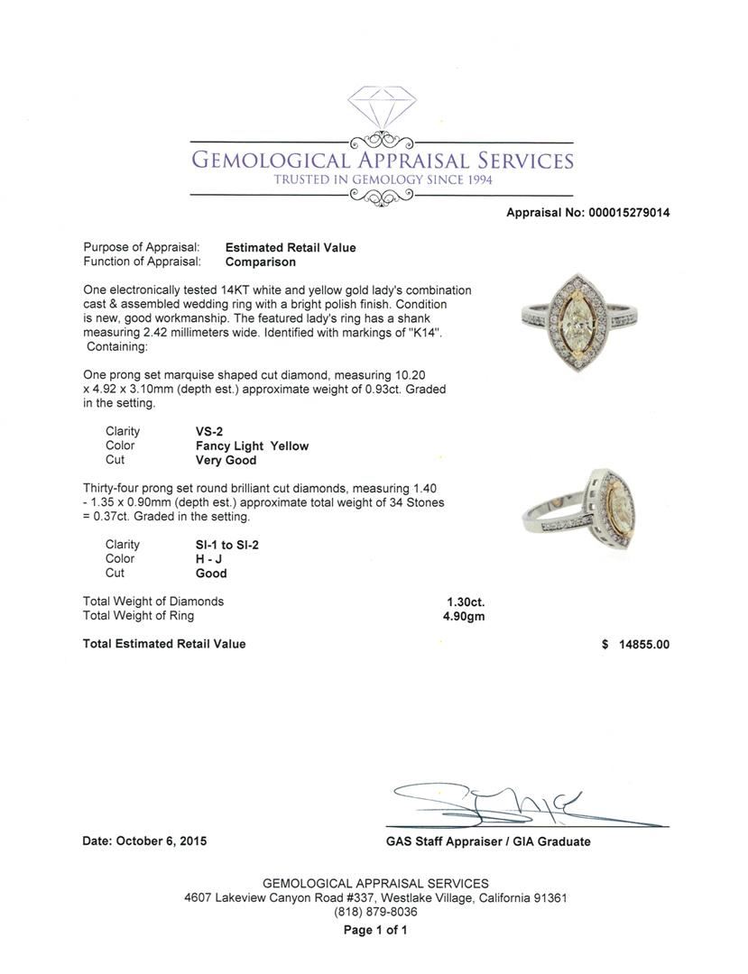 One electronically tested 14KT white and yellow gold lady's combination cast & assembled wedding ring with a bright polish finish. The featured lady's ring has a shank measuring 2.42 millimeters wide. Identified with markings of "K14". Condition is new, good workmanship. Containing: One prong set marquise shaped cut diamond, measuring 10.20 x 4.92 x 3.10mm (depth est.) approximate weight of 0.93ct. Graded in the setting. Clarity: VS-2 Cut Very Good Thirty-Four prong set round brilliant cut diamonds, measuring 1.40 - 1.35 x 0.90mm (depth est.) approximate total weight of 34 Stones = 0.37ct. Graded in the setting. Clarity: SI-1 to SI-2. Color: H - Good. Total Weight of Diamonds 1.30ct. Total Weight of Ring 4.90gm. GAS Appraised at $14,855.00.