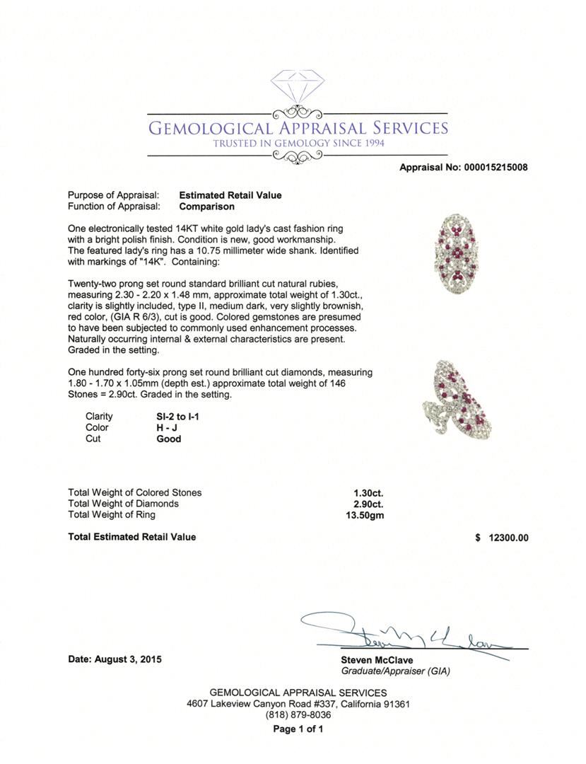 One electronically tested 14KT white gold lady's cast fashion ring with a bright polish finish. The featured lady's ring has a 10.75 millimeter wide shank. Identified with markings of "14K". Condition is new, good workmanship. Containing: Twenty-two prong set round standard brilliant cut natural rubies, measuring 2.30 - 2.20 x 1.48 mm, approximate total weight of 1.30ct., clarity is slightly included, type II, medium dark, very slightly brownish, red color, (GIA R 6/3), cut is good. Colored gemstones are presumed to have been subjected to commonly used enhancement processes. Naturally occurring internal & external characteristics are present. Graded in the setting. One Hundred Forty-Six prong set round brilliant cut diamonds, measuring 1.80 - 1.70 x 1.05mm (depth est.) approximate total weight of 146 Stones = 2.90ct. Graded in the setting. Clarity SI-2 to I-1 Color H - Good Total Weight of Colored Stones 1.30ct. Total Weight of Diamonds 2.90ct. Total Weight of Ring 13.50gm Gemological Appraisal Services at $12,300.00.