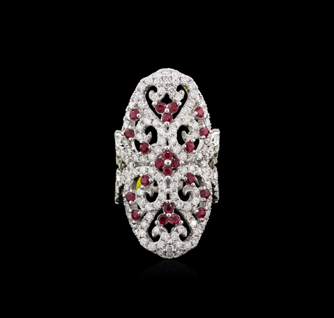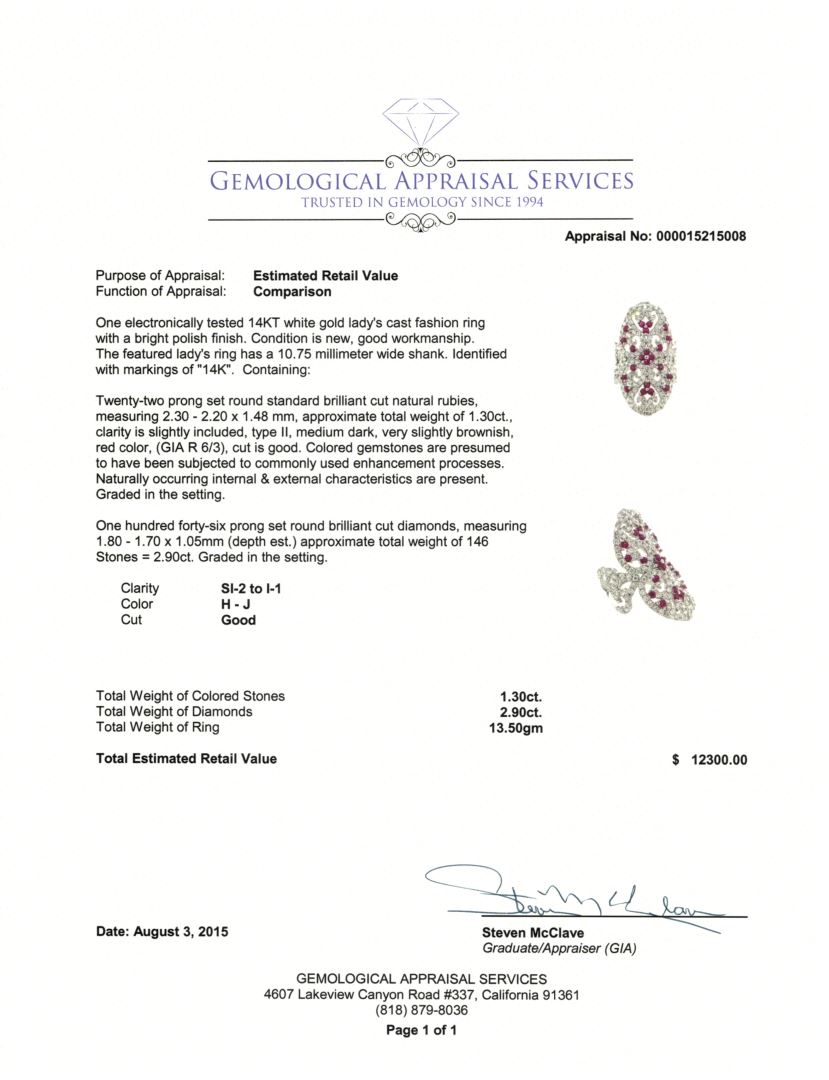 One electronically tested 14KT white gold lady's cast fashion ring with a bright polish finish. The featured lady's ring has a 10.75 millimeter wide shank. Identified with markings of "14K". Condition is new, good workmanship. Containing: Twenty-two prong set round standard brilliant cut natural rubies, measuring 2.30 - 2.20 x 1.48 mm, approximate total weight of 1.30ct., clarity is slightly included, type II, medium dark, very slightly brownish, red color, (GIA R 6/3), cut is good. Colored gemstones are presumed to have been subjected to commonly used enhancement processes. Naturally occurring internal & external characteristics are present. Graded in the setting. One Hundred Forty-Six prong set round brilliant cut diamonds, measuring 1.80 - 1.70 x 1.05mm (depth est.) approximate total weight of 146 Stones = 2.90ct. Graded in the setting. Clarity SI-2 to I-1 Color H - Good Total Weight of Colored Stones 1.30ct. Total Weight of Diamonds 2.90ct. Total Weight of Ring 13.50gm GAS Appraised at $12,300.00.