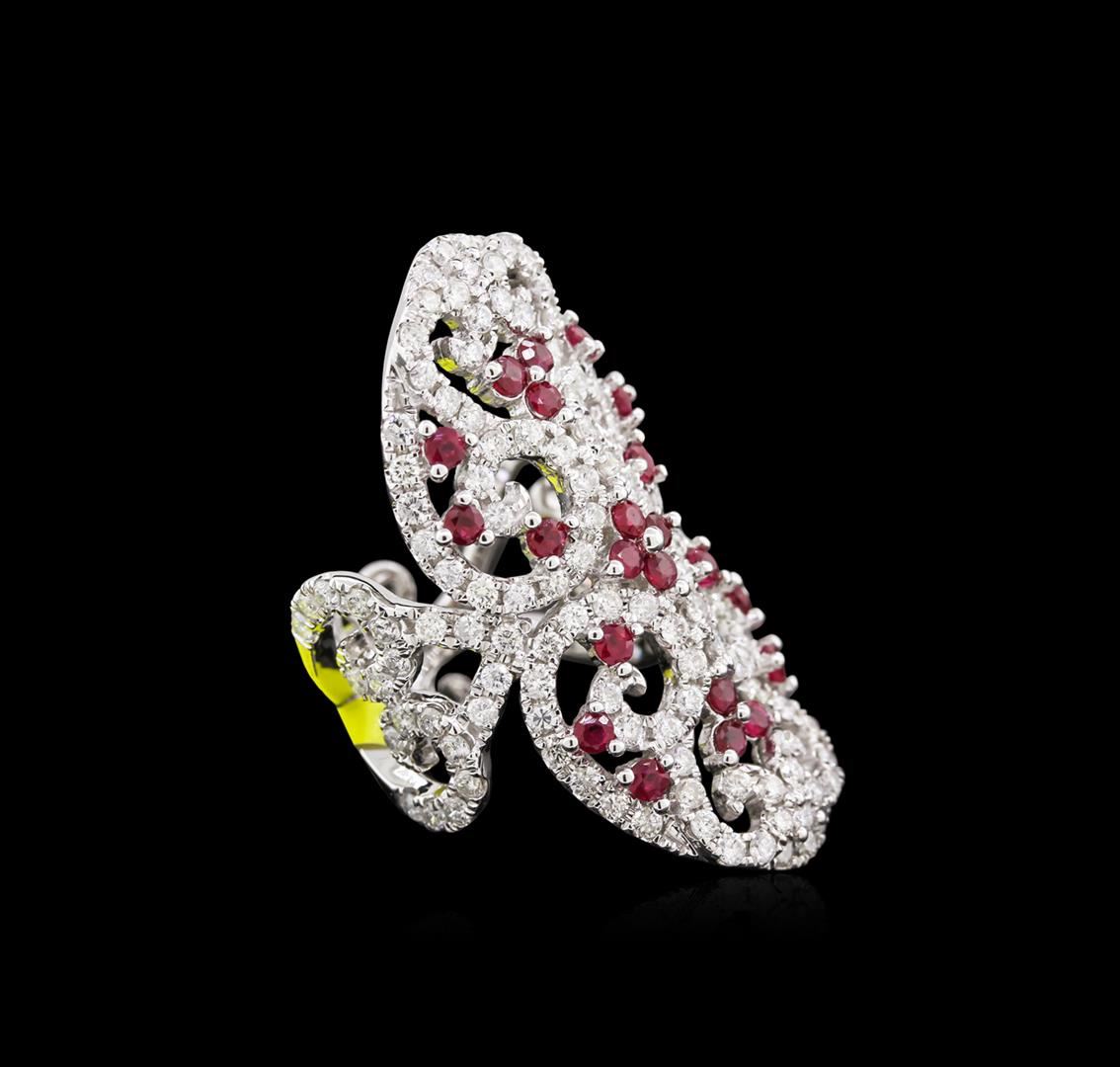 One electronically tested 14KT white gold lady's cast fashion ring with a bright polish finish. The featured lady's ring has a 10.75 millimeter wide shank. Identified with markings of "14K". Condition is new, good workmanship. Containing: Twenty-two prong set round standard brilliant cut natural rubies, measuring 2.30 - 2.20 x 1.48 mm, approximate total weight of 1.30ct., clarity is slightly included, type II, medium dark, very slightly brownish, red color, (GIA R 6/3), cut is good. Colored gemstones are presumed to have been subjected to commonly used enhancement processes. Naturally occurring internal & external characteristics are present. Graded in the setting. One Hundred Forty-Six prong set round brilliant cut diamonds, measuring 1.80 - 1.70 x 1.05mm (depth est.) approximate total weight of 146 Stones = 2.90ct. Graded in the setting. Clarity SI-2 to I-1 Color H - Good Total Weight of Colored Stones 1.30ct. Total Weight of Diamonds 2.90ct. Total Weight of Ring 13.50gm GAS Appraised at $12,300.00.