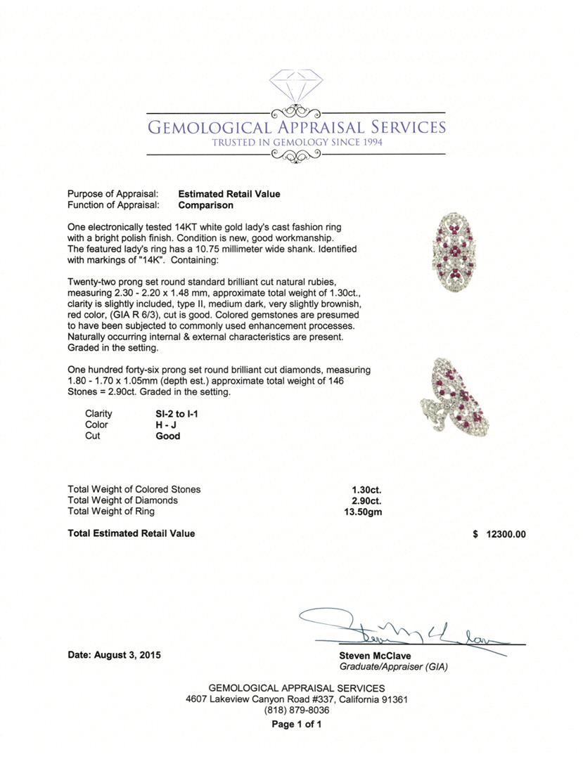 One electronically tested 14KT white gold lady's cast fashion ring with a bright polish finish. The featured lady's ring has a 10.75 millimeter wide shank. Identified with markings of "14K". Condition is new, good workmanship. Containing: Twenty-two prong set round standard brilliant cut natural rubies, measuring 2.30 - 2.20 x 1.48 mm, approximate total weight of 1.30ct., clarity is slightly included, type II, medium dark, very slightly brownish, red color, (GIA R 6/3), cut is good. Colored gemstones are presumed to have been subjected to commonly used enhancement processes. Naturally occurring internal & external characteristics are present. Graded in the setting. One Hundred Forty-Six prong set round brilliant cut diamonds, measuring 1.80 - 1.70 x 1.05mm (depth est.) approximate total weight of 146 Stones = 2.90ct. Graded in the setting. Clarity SI-2 to I-1 Color H - Good Total Weight of Colored Stones 1.30ct. Total Weight of Diamonds 2.90ct. Total Weight of Ring 13.50gm GAS Appraised at $12,300.00.