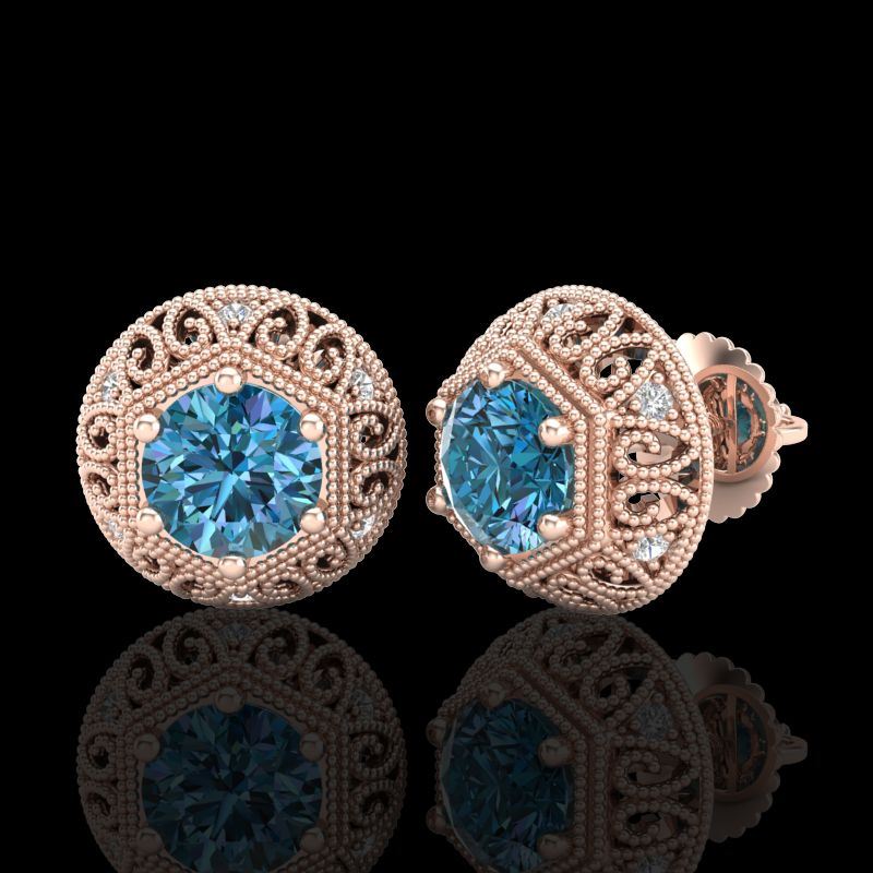 REF-149T3M -37559 ---- 1.31 CTW Fancy Intense Blue Diamond Art Deco Stud Earrings 18K Rose Gold ---- Luxury Designer Brand Earring Appraised at $9,850 Certificate Number US37559 18k Rose gold, Earring Size is Larger, Earring measuring approx. Uniform, weighing in total approx. 6 grams. Made in the USA and is stamped 18k, Main stone 1.2 carat total weight containing 2 pieces of Intense Fancy Blue color with SI quality Round shape cut Diamond , Stone #2 0.11 carat total weight containing 12 pieces of H-I color with VS/SI quality Round shape cut Diamond