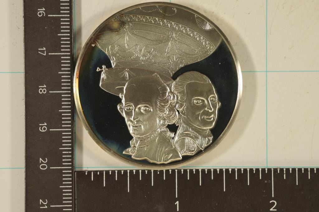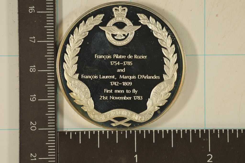 ROUND "FRANCOIS PILATRE DE ROZIER, 1754-1785 AND FRANCOIS LAURENT, MARQUIS D'ARLANDES 1742-1809 FIRST MEN TO FLY, 21ST NOVEMBER 1783" OFFICIAL ROYAL AIRFORCE MUSEUM MEDAL. IN HARD PLASTIC CAPSULE.