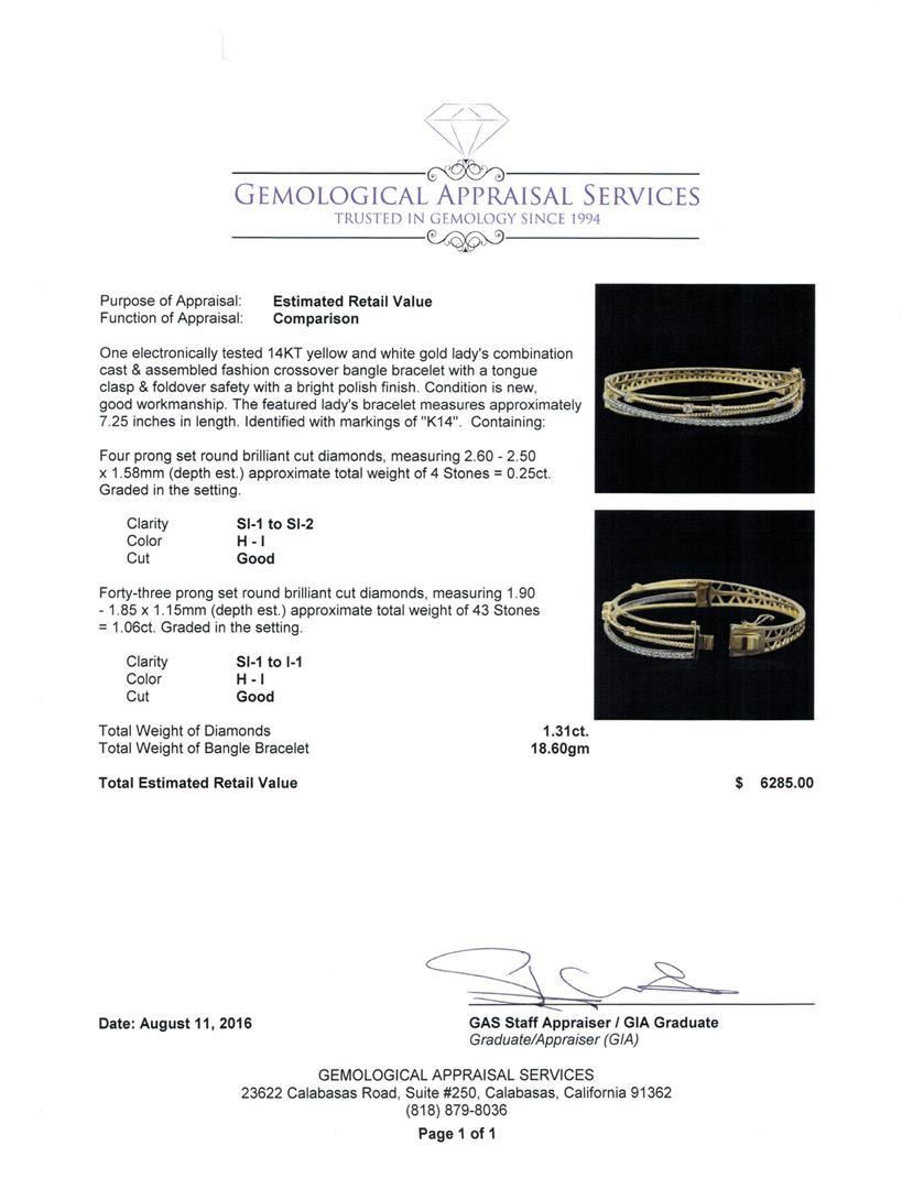 One electronically tested 14KT yellow and white gold lady's combination cast & assembled fashion crossover bangle bracelet with a tongue clasp & foldover safety with a bright polish finish. The featured lady's bracelet measures approximately 7.25 inches in length. Identified with markings of 'K14'. Condition is new, good workmanship. Containing: Four prong set round brilliant cut diamonds, measuring 2.60 - 2.50 x 1.58mm (depth est.) approximate total weight of 4 Stones = 0.25ct. Graded in the setting. Clarity SI-1 to SI-2. Color: H - I Cut Good Forty-Three prong set round brilliant cut diamonds, measuring 1.90 - 1.85 x 1.15mm (depth est.) approximate total weight of 43 Stones = 1.06ct. Graded in the setting. Clarity SI-1 to I-1. Color: H - I Cut Good. Total Weight of Diamonds 1.31ct.. Total Weight of Bangle Bracelet 18.60gm. GAS Appraised.