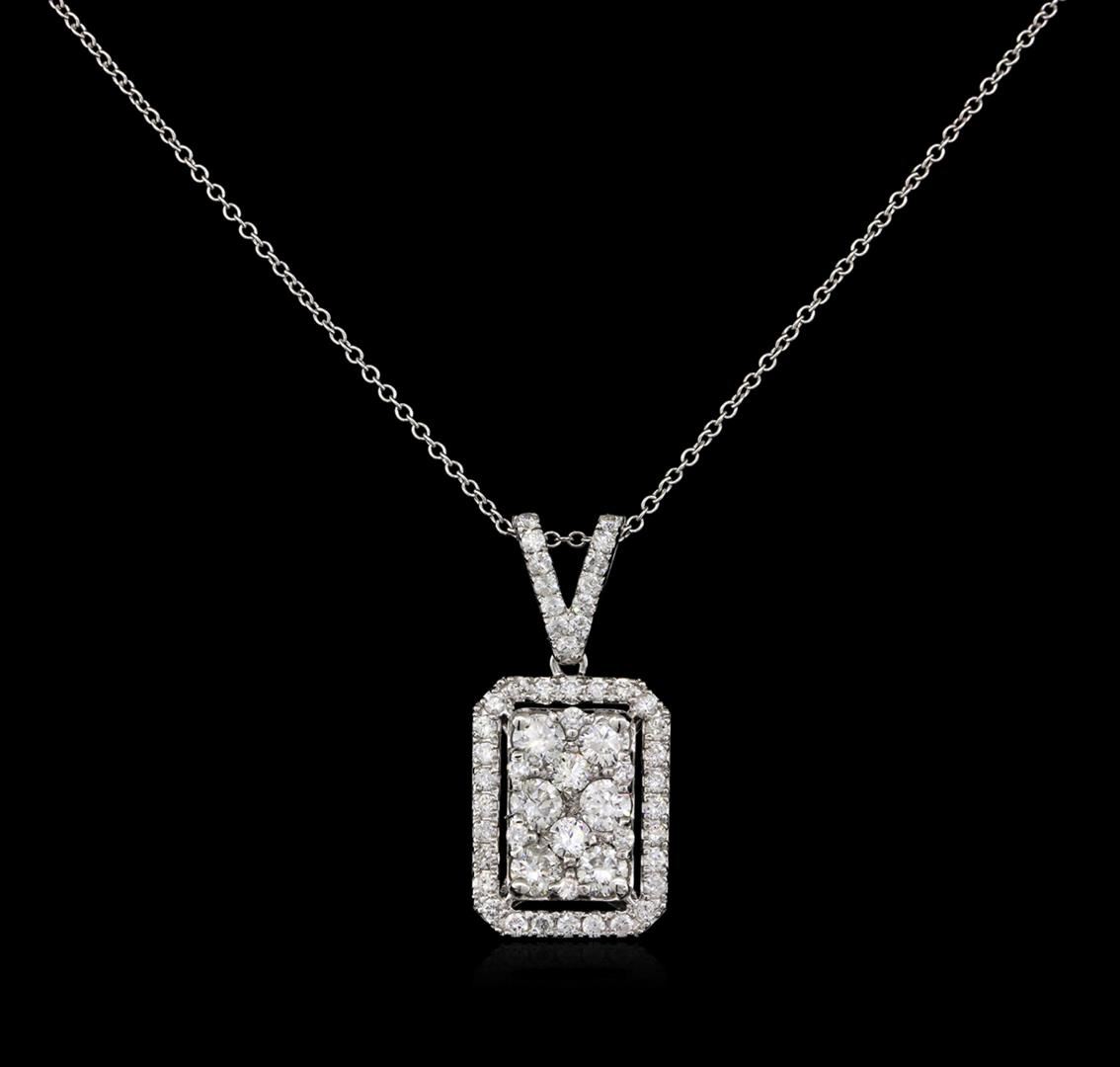 One electronically tested 14KT white gold lady's combination cast & assembled fashion pendant & chain 18.0" long, 1mm round cable link with a spring ring clasp with a bright polish finish. Identified with markings of "K14". Condition is new, good workmanship. Containing: Six prong set round brilliant cut diamonds, measuring 3.20 - 3.10 x 1.89mm (depth est.) approximate total weight of 6 Stones = 0.68ct. Graded in the setting. Clarity: SI-1 to I-1. Color: G - Good Two prong set round brilliant cut diamonds, measuring 2.70 - 2.60 x 1.64mm (depth est.) approximate total weight of 2 Stones = 0.14ct. Graded in the setting. Clarity: VS-2 to SI-1. Color: H - I. Cut Very Good Forty-Seven prong set round brilliant cut diamonds, measuring 1.45 - 1.35 x 0.87mm (depth est.) approximate total weight of 47 Stones = 0.49ct. Graded in the setting. Clarity: SI-1 to I-1. Color: H - I. Cut Good. Total Weight of Diamonds 1.31ct. Total Weight of Pendant & Chain 4.70gm. GAS Appraised at $3,905.00.