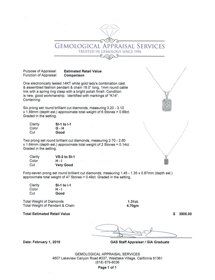 One electronically tested 14KT white gold lady's combination cast & assembled fashion pendant & chain 18.0" long, 1mm round cable link with a spring ring clasp with a bright polish finish. Identified with markings of "K14". Condition is new, good workmanship. Containing: Six prong set round brilliant cut diamonds, measuring 3.20 - 3.10 x 1.89mm (depth est.) approximate total weight of 6 Stones = 0.68ct. Graded in the setting. Clarity: SI-1 to I-1. Color: G - Good Two prong set round brilliant cut diamonds, measuring 2.70 - 2.60 x 1.64mm (depth est.) approximate total weight of 2 Stones = 0.14ct. Graded in the setting. Clarity: VS-2 to SI-1. Color: H - I. Cut Very Good Forty-Seven prong set round brilliant cut diamonds, measuring 1.45 - 1.35 x 0.87mm (depth est.) approximate total weight of 47 Stones = 0.49ct. Graded in the setting. Clarity: SI-1 to I-1. Color: H - I. Cut Good. Total Weight of Diamonds 1.31ct. Total Weight of Pendant & Chain 4.70gm. GAS Appraised.
