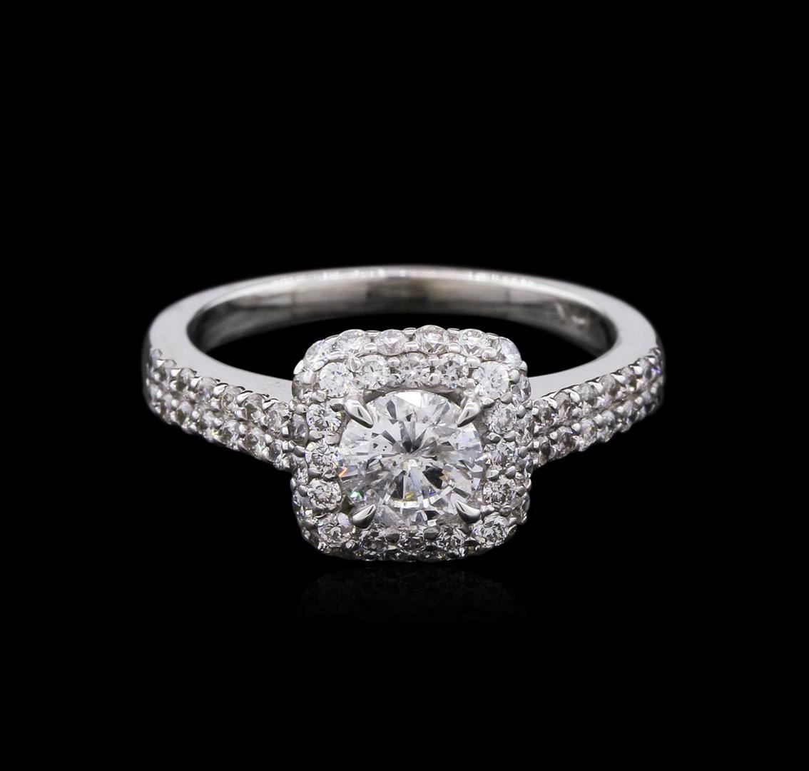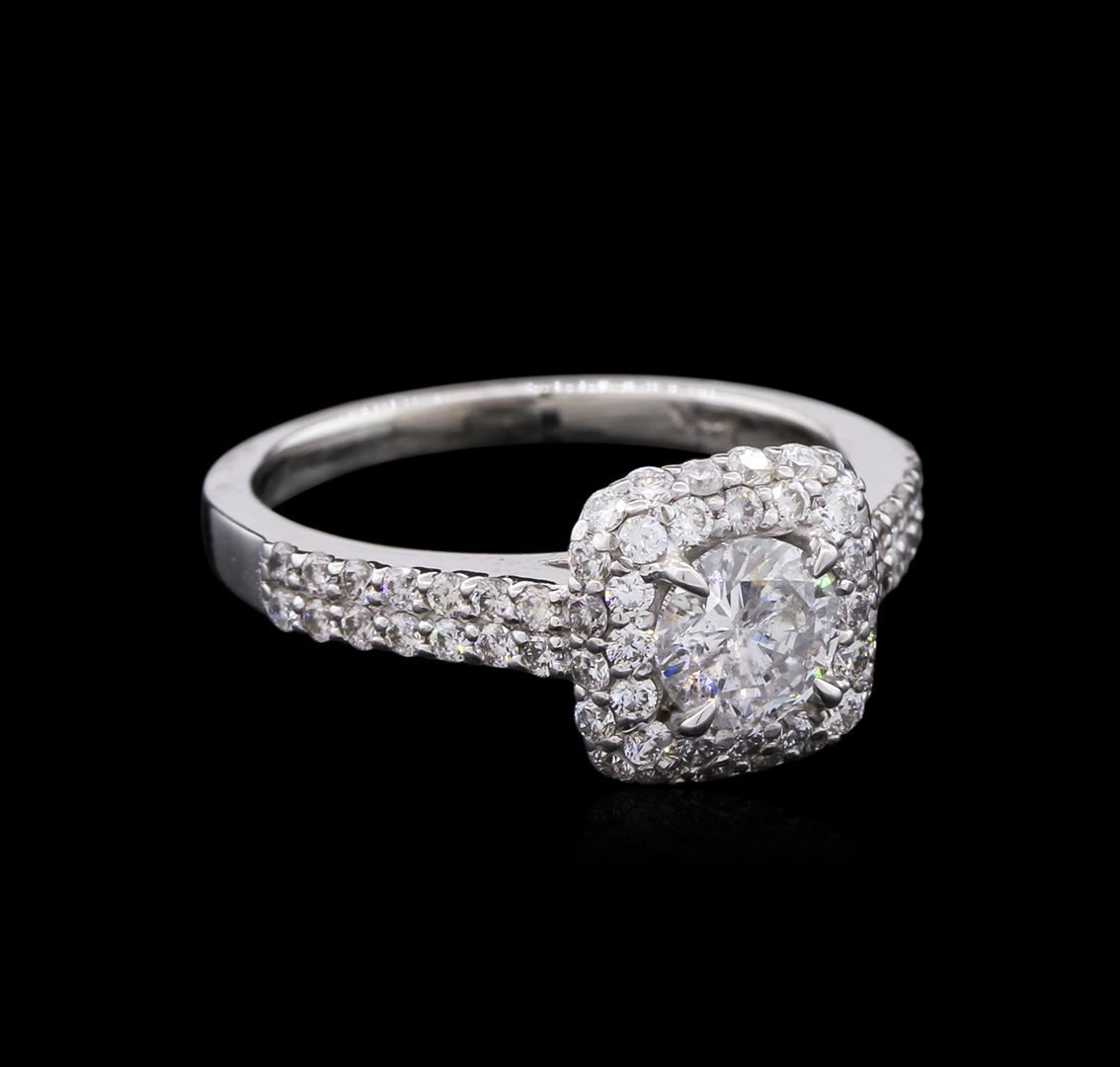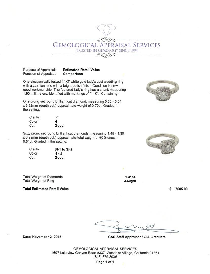 One electronically tested 14KT white gold lady's cast wedding ring with a cushion halo with a bright polish finish. The featured lady's ring has a shank measuring 1.90 millimeters. Identified with markings of "14K". Condition is new, good workmanship. Containing: One prong set round brilliant cut diamond, measuring 5.60 - 5.54 x 3.62mm (depth est.) approximate weight of 0.70ct. Graded in the setting. Clarity: I-1. Color: Good Sixty prong set round brilliant cut diamonds, measuring 1.45 - 1.30 x 0.88mm (depth est.) approximate total weight of 60 Stones = 0.61ct. Graded in the setting. Clarity: SI-1 to SI-2. Color: H - Good. Total Weight of Diamonds 1.31ct. Total Weight of Ring 3.60gm GAS Appraised at $7,605.00.