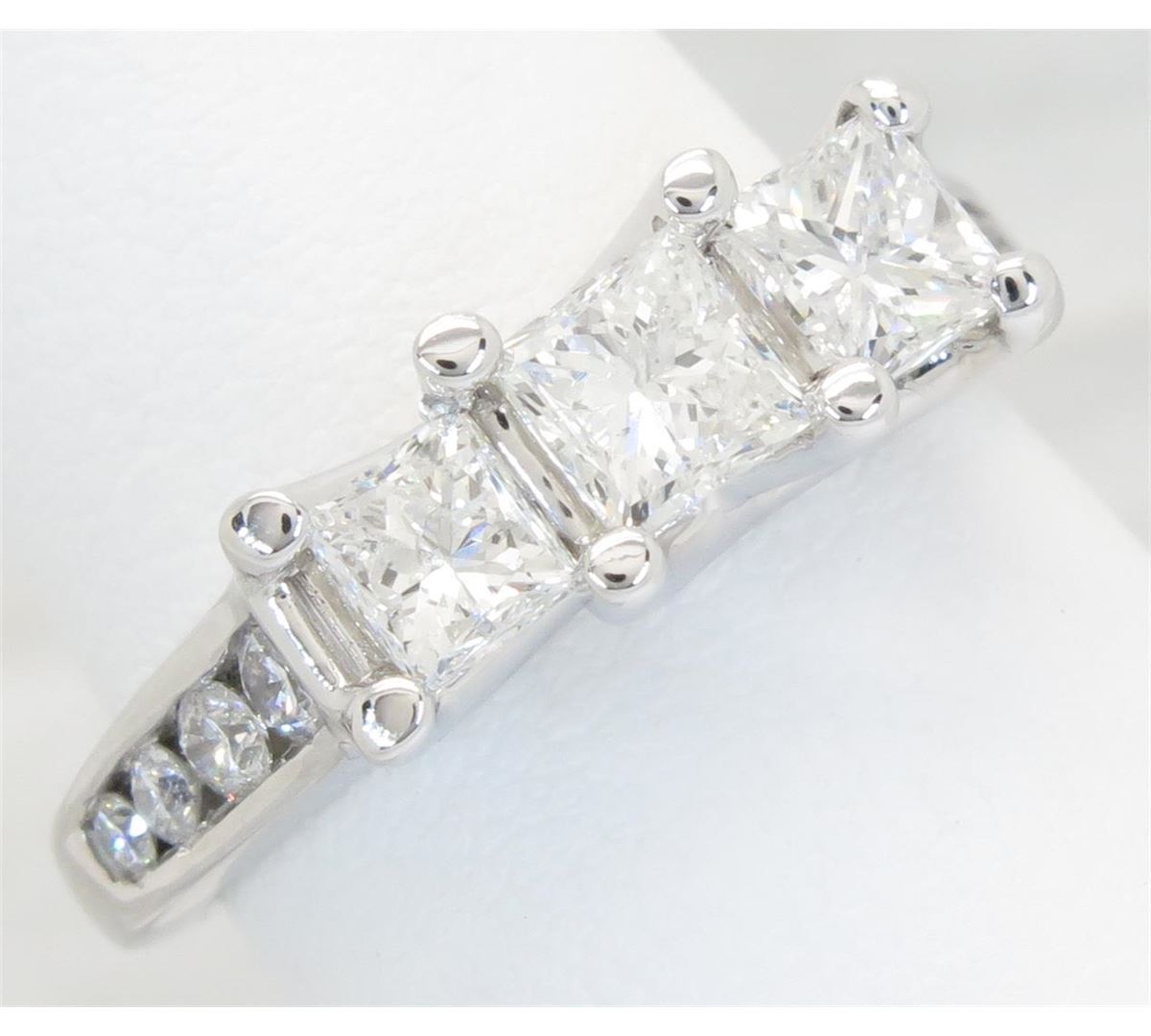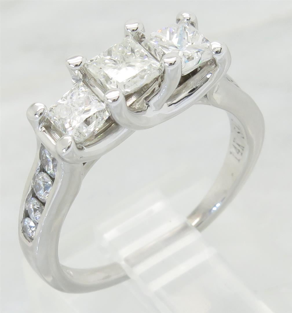 One tested 14K white gold diamond ring. Containing: One Princess Cut Diamond. Approximate Size: .42CT, Clarity: I, Color: G-H. 8 Round Brilliant Cut Diamonds, 2 Princess Cut Diamonds. Approximate total diamond weight: 1.31CTW. All diamonds are graded in the mounting unless otherwise stated. Weight of ring: 4.1 grams, Size: 5.0. The ring is engraved "Past Present Future" with two Round Brilliant Cut Diamonds set in between the words.