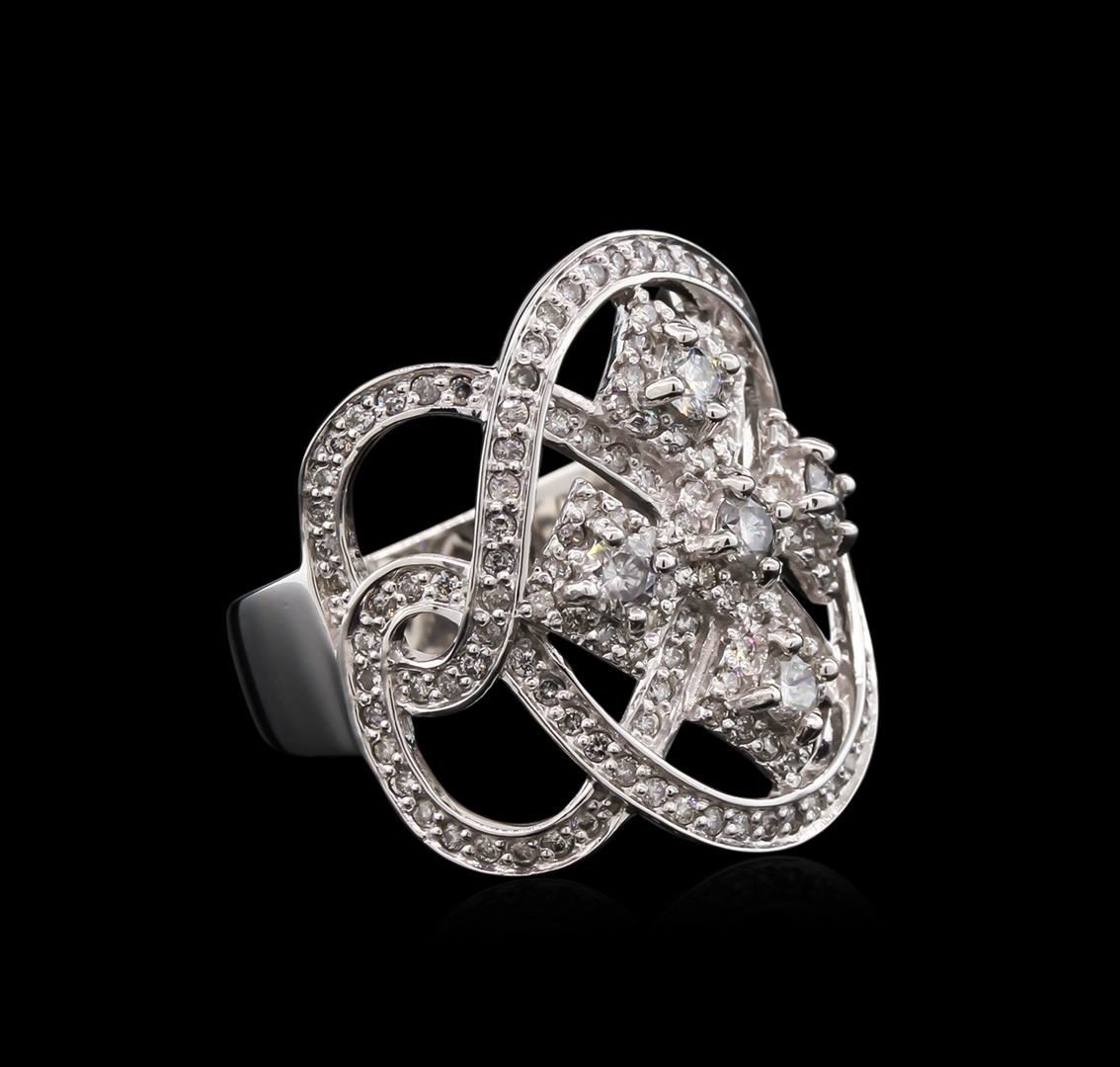 One electronically tested 14KT white gold lady's cast fashion ring with a bright polish finish. The featured lady's ring has a wide band byzantine motif and a shank measuring 4.60 millimeters wide. Identified with markings of "585". Condition is new, good workmanship. Containing: Five prong set round brilliant cut diamonds, measuring 2.90 - 2.85 x 1.84mm (depth est.) approximate total weight of 5 Stones = 0.46ct. Graded in the setting. Clarity: I-1. Color: H - Good One Hundred Seventy-One prong set round brilliant cut diamonds, measuring 1.10 - 1.05 x 0.70mm (depth est.) approximate total weight of 171 Stones = 0.85ct. Graded in the setting. Clarity: SI-2 to I-1. Color: H - I. Cut Good. Total Weight of Diamonds 1.31ct. Total Weight of Ring 8.50gm. GAS Appraised at $5,950.00.
