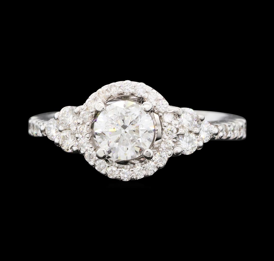 One electronically tested 14KT white gold lady's cast wedding ring with a basket halo with a bright polish finish. The featured lady's ring has a shank measuring 3.00 millimeters wide. Identified with markings of 'K14'. Condition is new, good workmanship. Containing: One prong set round brilliant cut diamond, measuring 5.63 - 5.61 x 3.54mm (depth est.) , 5.00.%. GTCF approximate weight of 0.71ct. Graded in the setting. Color G - H Clarity I-1 Cut Very Good Six prong set round brilliant cut diamonds, measuring 2.40 - 2.30 x 1.46mm (depth est.) approximate total weight of 6 Stones = 0.30ct. Graded in the setting. Color H - I Clarity SI-1 to SI-3 Cut Good Ten prong set round brilliant cut diamonds, measuring 1.85 - 1.40 x 1.01mm (depth est.) approximate total weight of 10 Stones = 0.18ct. Graded in the setting. Color H - I Clarity SI-1 to SI-2 Cut Good Twenty prong set round brilliant cut diamonds, measuring 1.20 - 1.15 x 0.73mm (depth est.) approximate total weight of 20 Stones = 0.12ct. Graded in the setting. Color H - I Clarity SI-1 to I-1 Cut Good. Total Weight of Diamonds 1.31ct.. Total Weight of Ring 4.20gm GAS Appraised at $7,495.00.