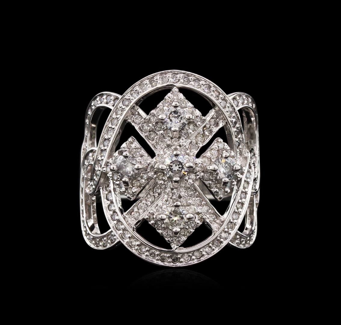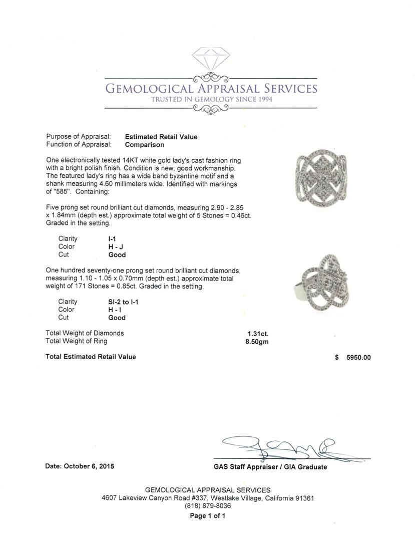 One electronically tested 14KT white gold lady's cast fashion ring with a bright polish finish. The featured lady's ring has a wide band byzantine motif and a shank measuring 4.60 millimeters wide. Identified with markings of "585". Condition is new, good workmanship. Containing: Five prong set round brilliant cut diamonds, measuring 2.90 - 2.85 x 1.84mm (depth est.) approximate total weight of 5 Stones = 0.46ct. Graded in the setting. Clarity: I-1. Color: H - Good One Hundred Seventy-One prong set round brilliant cut diamonds, measuring 1.10 - 1.05 x 0.70mm (depth est.) approximate total weight of 171 Stones = 0.85ct. Graded in the setting. Clarity: SI-2 to I-1. Color: H - I. Cut Good. Total Weight of Diamonds 1.31ct. Total Weight of Ring 8.50gm. GAS Appraised at $5,950.00.