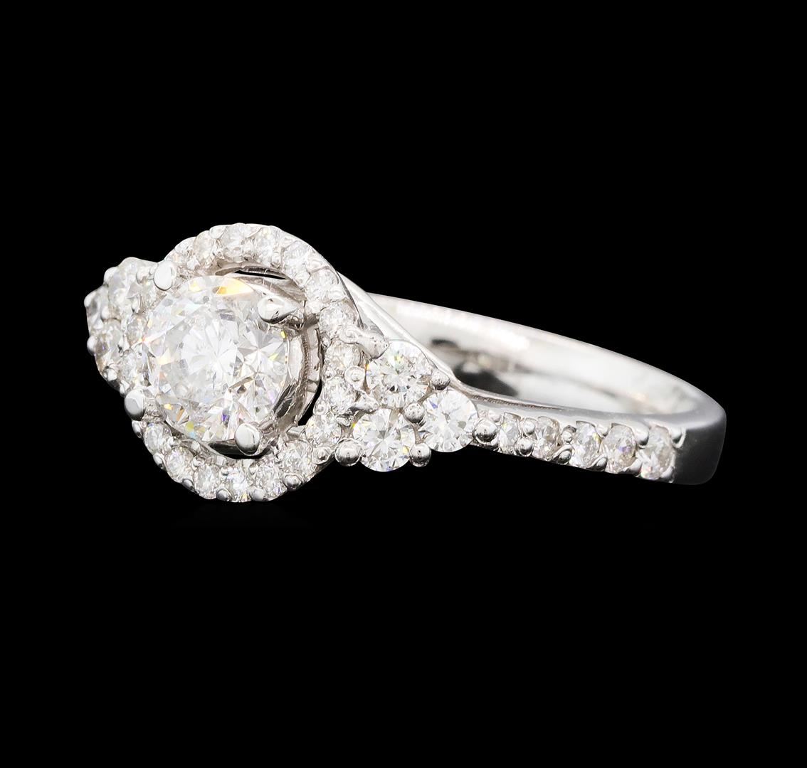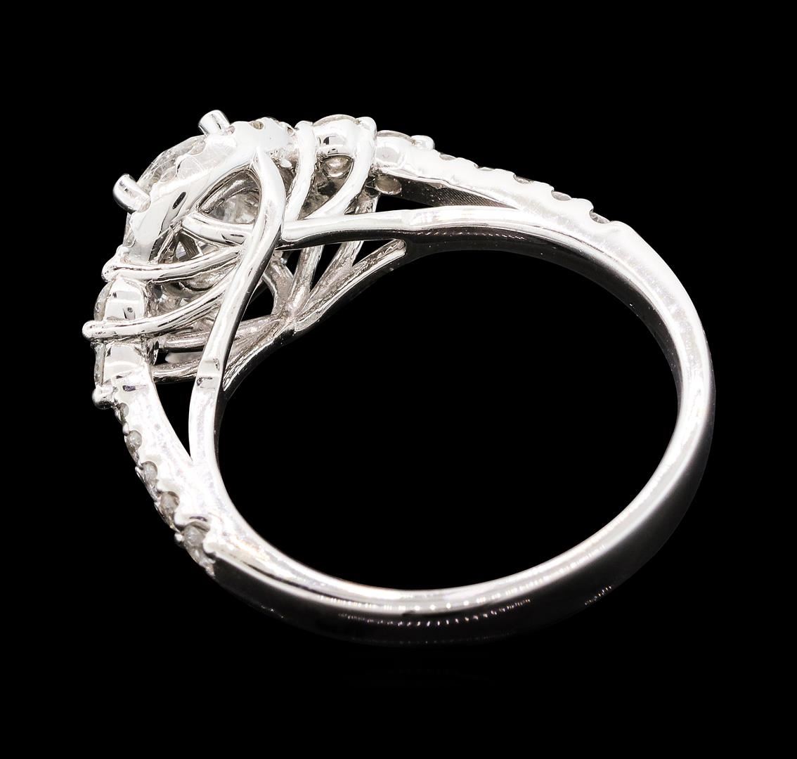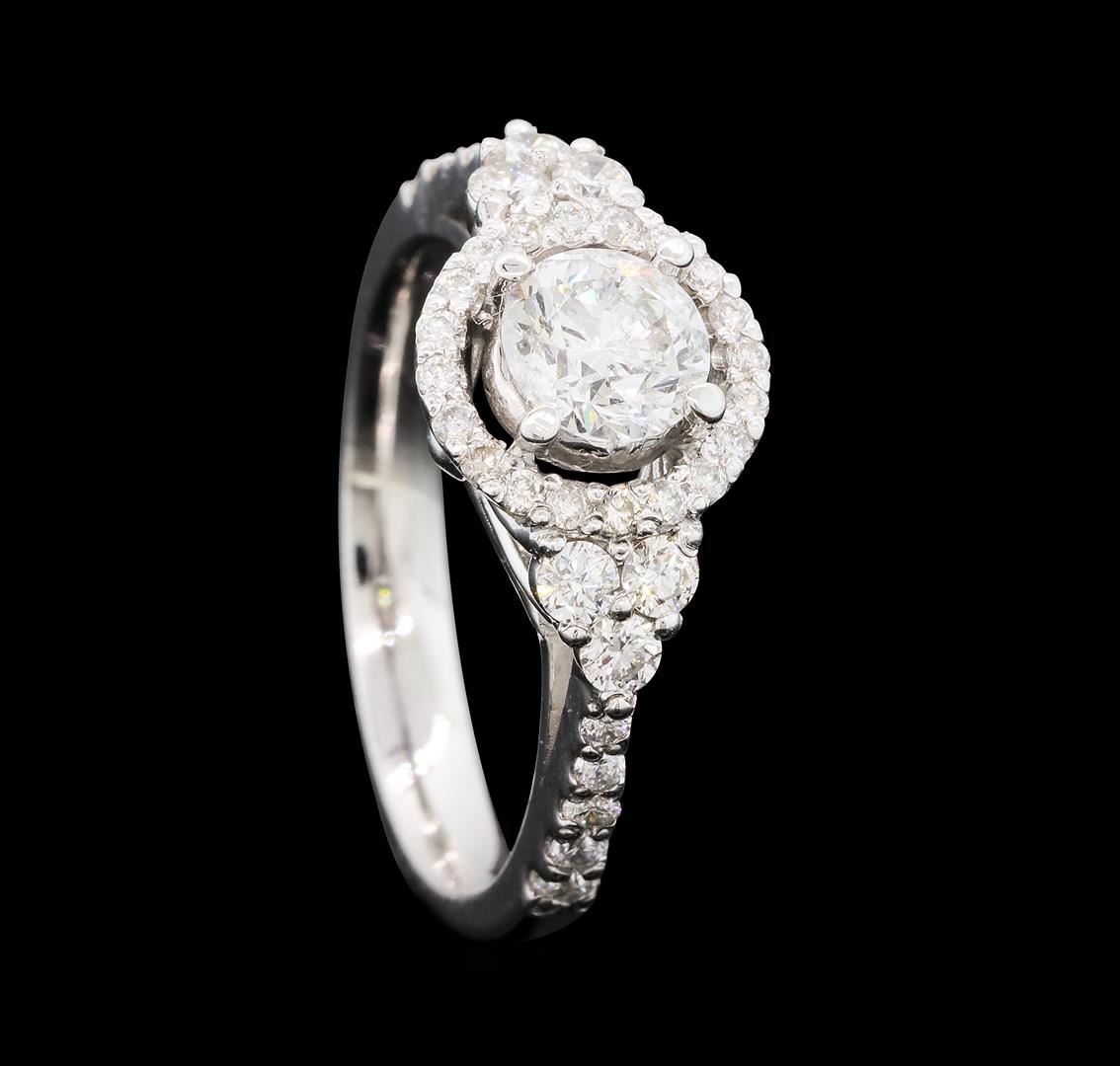 One electronically tested 14KT white gold lady's cast wedding ring with a basket halo with a bright polish finish. The featured lady's ring has a shank measuring 3.00 millimeters wide. Identified with markings of 'K14'. Condition is new, good workmanship. Containing: One prong set round brilliant cut diamond, measuring 5.63 - 5.61 x 3.54mm (depth est.) , 5.00.%. GTCF approximate weight of 0.71ct. Graded in the setting. Color G - H Clarity I-1 Cut Very Good Six prong set round brilliant cut diamonds, measuring 2.40 - 2.30 x 1.46mm (depth est.) approximate total weight of 6 Stones = 0.30ct. Graded in the setting. Color H - I Clarity SI-1 to SI-3 Cut Good Ten prong set round brilliant cut diamonds, measuring 1.85 - 1.40 x 1.01mm (depth est.) approximate total weight of 10 Stones = 0.18ct. Graded in the setting. Color H - I Clarity SI-1 to SI-2 Cut Good Twenty prong set round brilliant cut diamonds, measuring 1.20 - 1.15 x 0.73mm (depth est.) approximate total weight of 20 Stones = 0.12ct. Graded in the setting. Color H - I Clarity SI-1 to I-1 Cut Good. Total Weight of Diamonds 1.31ct.. Total Weight of Ring 4.20gm GAS Appraised at $7,495.00.