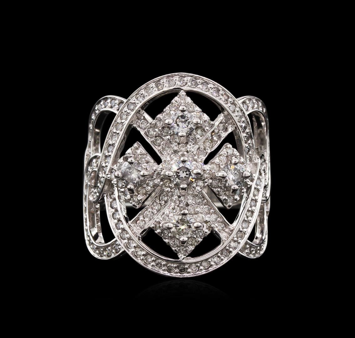 One electronically tested 14KT white gold lady's cast fashion ring with a bright polish finish. The featured lady's ring has a wide band byzantine motif and a shank measuring 4.60 millimeters wide. Identified with markings of "585". Condition is new, good workmanship. Containing: Five prong set round brilliant cut diamonds, measuring 2.90 - 2.85 x 1.84mm (depth est.) approximate total weight of 5 Stones = 0.46ct. Graded in the setting. Clarity: I-1. Color: H - Good One Hundred Seventy-One prong set round brilliant cut diamonds, measuring 1.10 - 1.05 x 0.70mm (depth est.) approximate total weight of 171 Stones = 0.85ct. Graded in the setting. Clarity: SI-2 to I-1. Color: H - I. Cut Good. Total Weight of Diamonds 1.31ct. Total Weight of Ring 8.50gm. GAS Appraised.
