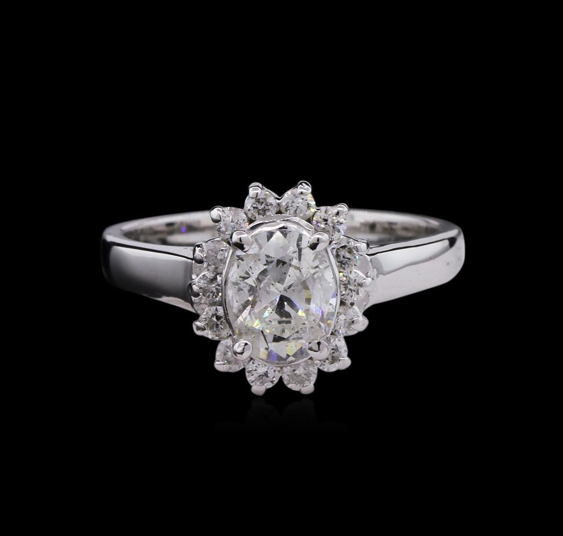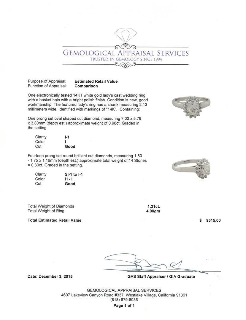 One electronically tested 14KT white gold lady's cast wedding ring with a basket halo with a bright polish finish. The featured lady's ring has a shank measuring 2.13 millimeters wide. Identified with markings of "14K". Condition is new, good workmanship. Containing: One prong set oval shaped cut diamond, measuring 7.03 x 5.76 x 3.80mm (depth est.) approximate weight of 0.98ct. Graded in the setting. Clarity: I-1. Color: I. Cut Good Fourteen prong set round brilliant cut diamonds, measuring 1.80 - 1.75 x 1.16mm (depth est.) approximate total weight of 14 Stones = 0.33ct. Graded in the setting. Clarity: SI-1 to I-1. Color: H - I. Cut Good. Total Weight of Diamonds 1.31ct. Total Weight of Ring 4.00gm. GAS Appraised.