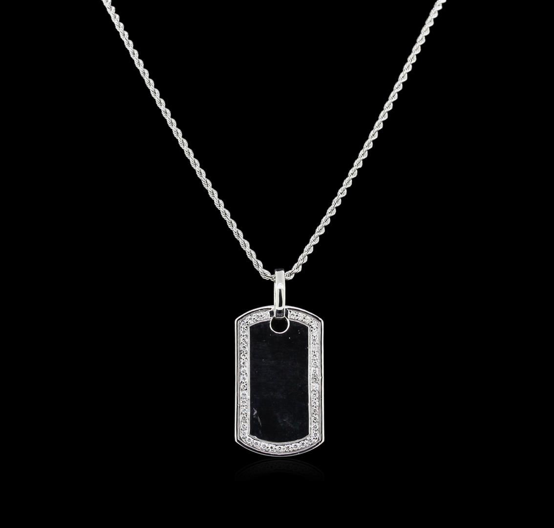 One electronically tested 14KT white gold mens cast diamond tag pendant and chain 18.0" long, with a lobster claw clasp with a bright polish finish. Identified with markings of "14K". Condition is new. Containing: Forty-Five prong set round brilliant cut diamonds, measuring 2.00 - 2.00 x 1.20mm (depth est.) approximate total weight of 45 Stones = 1.31ct. Clarity: VS-2 to SI-1. Color: H - I, Cut is Good. Diamonds are graded in the mounting, unless otherwise stated. Total Weight of Diamonds 1.31ct. Total Weight of Tag Pendant And Chain 39.70 grams. GGL Appraised at $7,435.00.