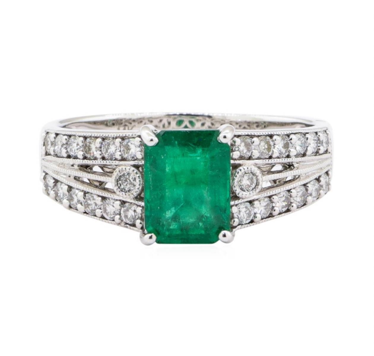 One electronically tested 14KT white gold ladies cast emerald & diamond ring. Condition is new, good workmanship. The featured emerald is set within diamond set shoulders, supported by a lattice ?oral under gallery, completed by a two millimeter wide band. Bright polish ?nish with milgrain detailing throughout. Trademark is Orianne. Identi?ed with markings of "14K". Containing: One prong set emerald standard step cut natural emerald, measuring 7.85 x 5.95 x 3.70mm, 5% bulge factor, approximate weight of l.3lct., clarity is heavily included, type HI, medium, very slightly grayish, very slightly bluish green color, (GIA vslbG 5/ 3), out is good. Transmitting light with a minimum of distortion, transparent. Naturally occurring internal 8; external characteristics are present. Indications of oil residue. Graded in the setting. Twenty-six prong & bezel set round brilliant cut diamonds, measuring 1.70 - 1.60 x 0.99mIn (depth est.) approximate total weight of 26 Stones = 0.41ct. Graded in the setting. Clarity SI-1 to I-1 Color F - H Total Weight of Colored Stones 1.31ct. Total Weight of Diamonds 0.41ct. Total Weight of Ring 3.79 gm Total Estimated Retail Value $ 3,100.00 US