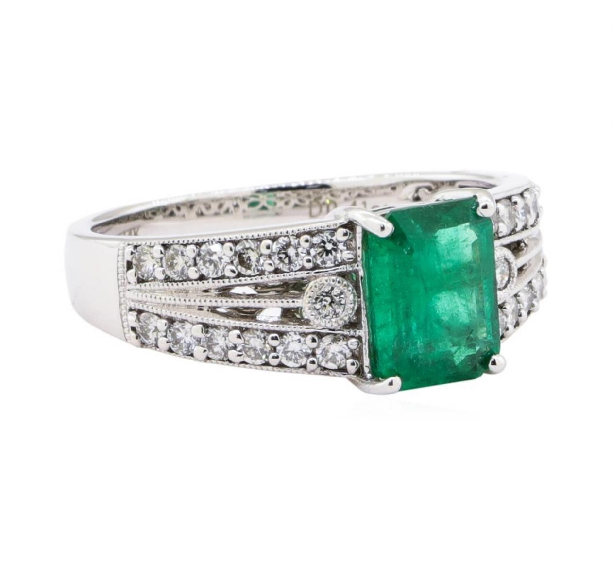 One electronically tested 14KT white gold ladies cast emerald & diamond ring. Condition is new, good workmanship. The featured emerald is set within diamond set shoulders, supported by a lattice ?oral under gallery, completed by a two millimeter wide band. Bright polish ?nish with milgrain detailing throughout. Trademark is Orianne. Identi?ed with markings of "14K". Containing: One prong set emerald standard step cut natural emerald, measuring 7.85 x 5.95 x 3.70mm, 5% bulge factor, approximate weight of l.3lct., clarity is heavily included, type HI, medium, very slightly grayish, very slightly bluish green color, (GIA vslbG 5/ 3), out is good. Transmitting light with a minimum of distortion, transparent. Naturally occurring internal 8; external characteristics are present. Indications of oil residue. Graded in the setting. Twenty-six prong & bezel set round brilliant cut diamonds, measuring 1.70 - 1.60 x 0.99mIn (depth est.) approximate total weight of 26 Stones = 0.41ct. Graded in the setting. Clarity SI-1 to I-1 Color F - H Total Weight of Colored Stones 1.31ct. Total Weight of Diamonds 0.41ct. Total Weight of Ring 3.79 gm Total Estimated Retail Value $ 3,100.00 US