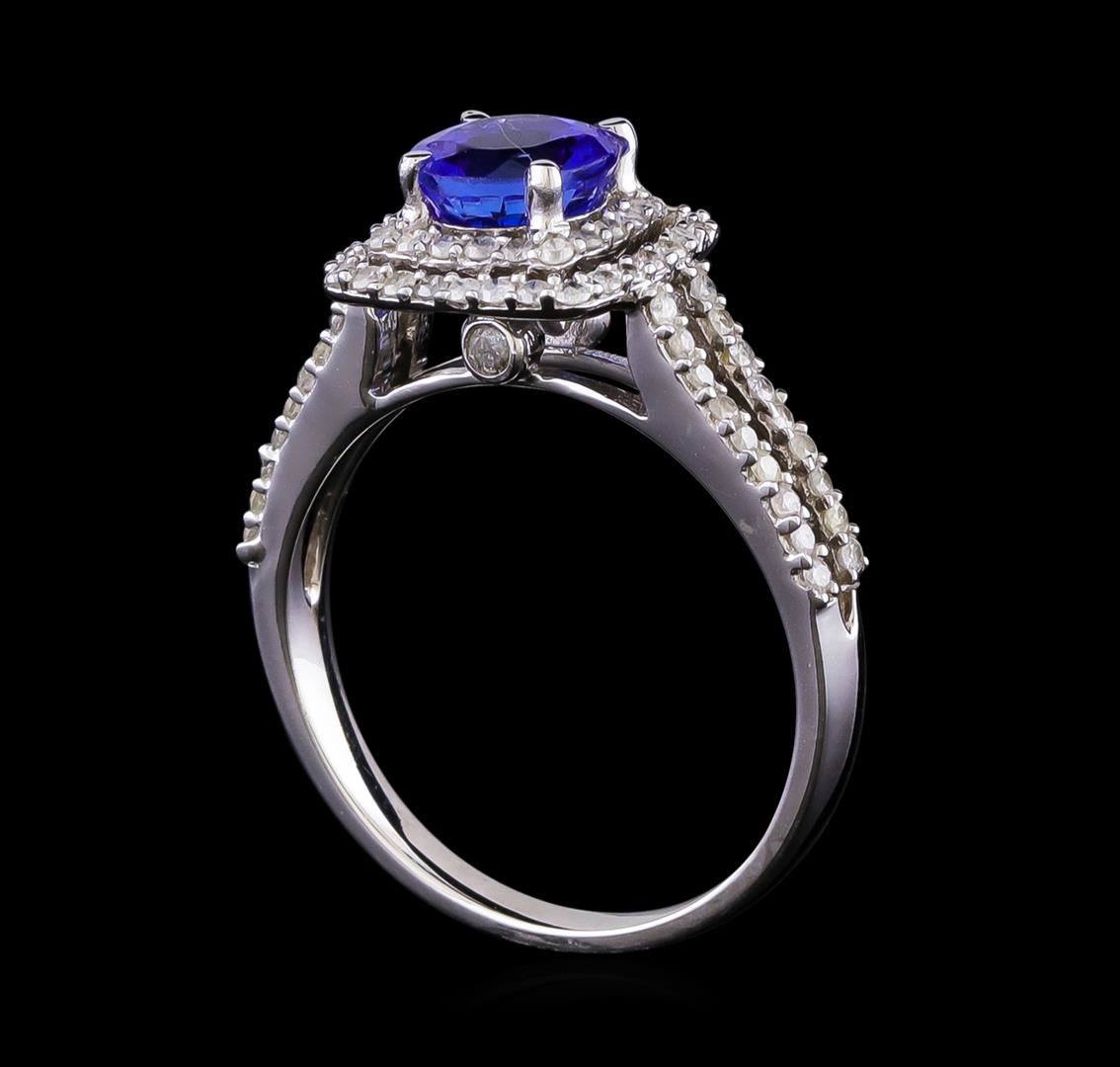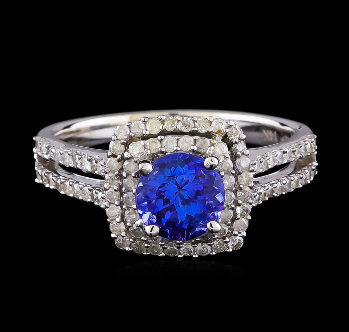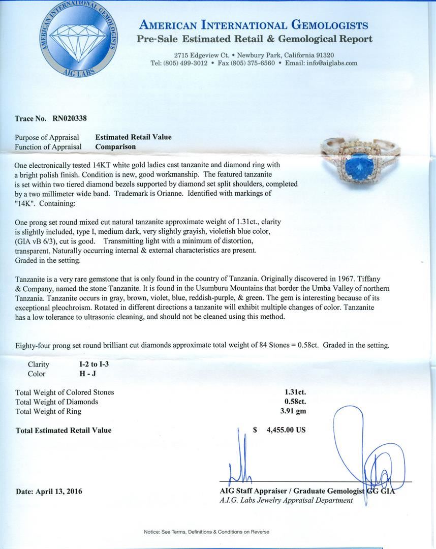 One electronically tested 14KT white gold ladies cast tanzanite and diamond ring with a bright polish finish. The featured tanzanite is set within two tiered diamond bezels supported by diamond set split shoulders, completed by a two millimeter wide band. Trademark is Orianne. Identified with markings of "14K". Condition is new, good workmanship. Containing: One prong set round mixed cut natural tanzanite approximate weight of 1.31ct., clarity is slightly included, type I, medium dark, very slightly grayish, violetish blue color, (GIA vB 6/3), cut is good. Transmitting light with a minimum of distortion, transparent. Naturally occurring internal & external characteristics are present. Graded in the setting. Tanzanite is a very rare gemstone that is only found in the country of Tanzania. Originally discovered in 1967. Tiffany & Company, named the stone Tanzanite. It is found in the Usumburu Mountains that border the Umba Valley of northern Tanzania. Tanzanite occurs in gray, brown, violet, blue, reddish-purple, & green. The gem is interesting because of its exceptional pleochroism. Rotated in different directions a tanzanite will exhibit multiple changes of color. Tanzanite has a low tolerance to ultrasonic cleaning, and should not be cleaned using this method. Eighty-Four prong set round brilliant cut diamonds approximate total weight of 84 Stones = 0.58ct. Graded in the setting. Clarity: I-2 to I-3. Color: H - J. Total Weight of Colored Stones 1.31ct. Total Weight of Diamonds 0.58ct. Total Weight of Ring 3.91gm. AIG Appraised at $4,455.00.