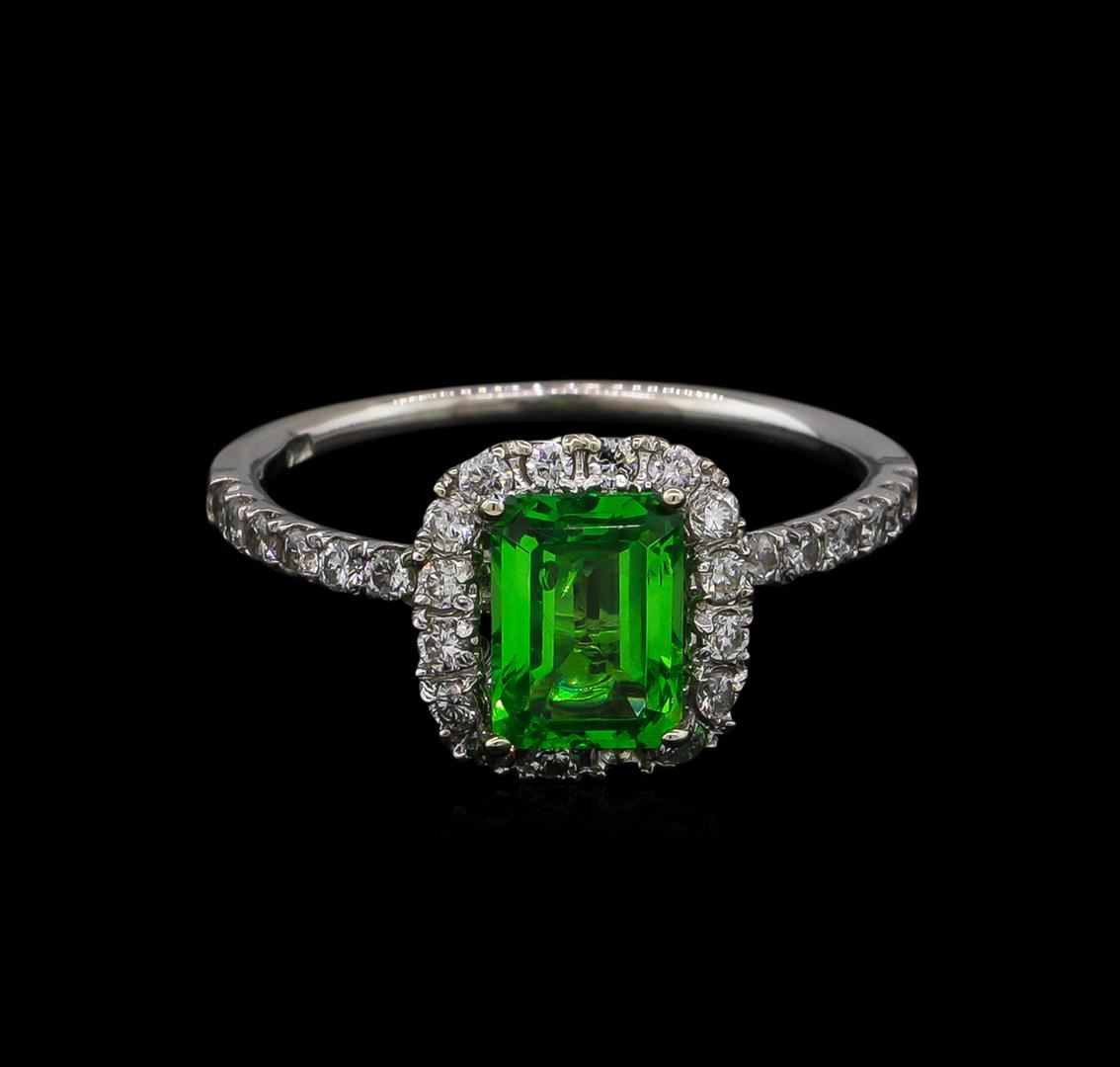 One electronically tested 14KT white gold lady's cast fashion ring with a cathedral halo with a bright polish finish. The featured lady's ring has a shank measuring 1.37 millimeters wide. Identified with markings of "K14". Condition is new, good workmanship. Containing: One prong set emerald step cut natural tsavorite garnet, measuring 7.45 x 5.42 x 3.40mm, approximate weight of 1.31ct., clarity is slightly included, type II, medium dark, moderately strong, slightly yellowish green color, (GIA slyG 6/4), cut is good. Transmitting light with a minimum of distortion, transparent. Colored gemstones are presumed to have been subjected to commonly used enhancement processes. Graded in the setting. Thirty prong set round brilliant cut diamonds, measuring 1.60 - 1.50 x 0.96mm (depth est.) approximate total weight of 30 Stones = 0.43ct. Graded in the setting. Clarity: SI-1 to I-1. Color: G - Good. Total Weight of Colored Stones 1.31ct. Total Weight of Diamonds 0.43ct. Total Weight of Ring 2.40gm. GAS Appraised at $4,810.00.