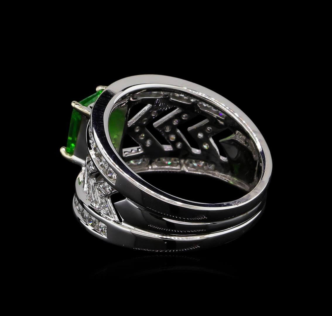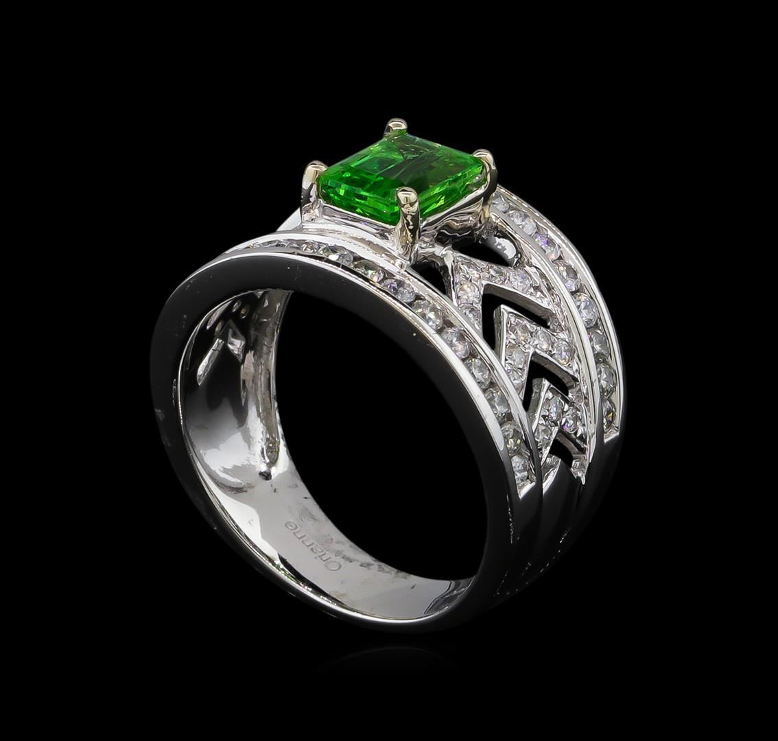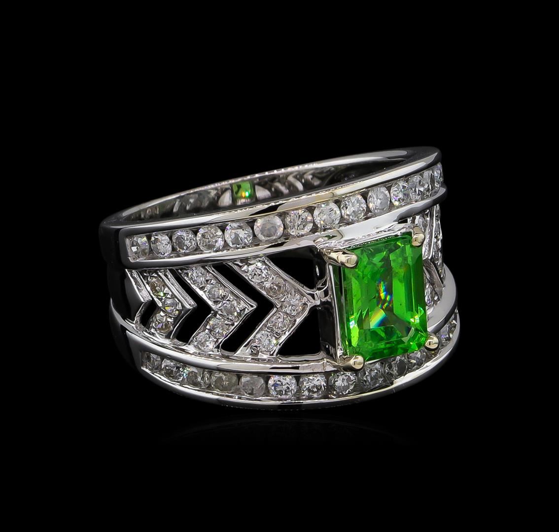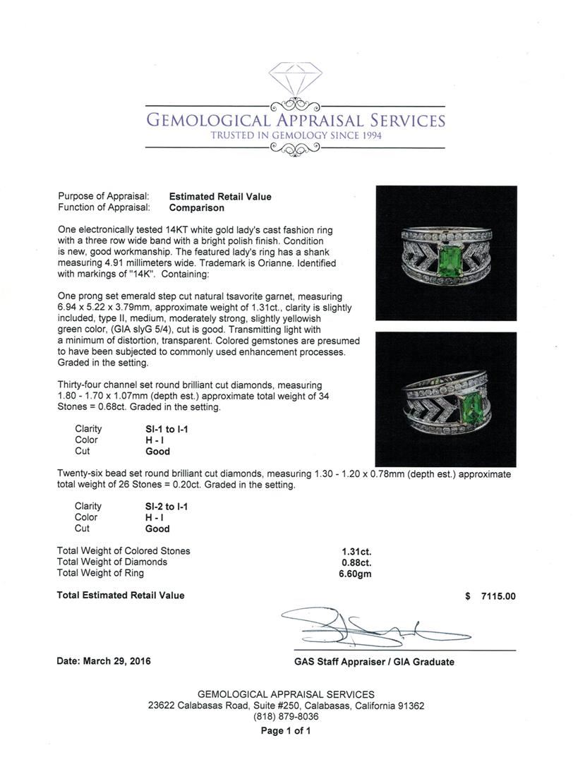 One electronically tested 14KT white gold lady's cast fashion ring with a three row wide band with a bright polish finish. The featured lady's ring has a shank measuring 4.91 millimeters wide. Trademark is Orianne. Identified with markings of "14K". Condition is new, good workmanship. Containing: One prong set emerald step cut natural tsavorite garnet, measuring 6.94 x 5.22 x 3.79mm, approximate weight of 1.31ct., clarity is slightly included, type II, medium, moderately strong, slightly yellowish green color, (GIA slyG 5/4), cut is good. Transmitting light with a minimum of distortion, transparent. Colored gemstones are presumed to have been subjected to commonly used enhancement processes. Graded in the setting. Thirty-Four channel set round brilliant cut diamonds, measuring 1.80 - 1.70 x 1.07mm (depth est.) approximate total weight of 34 Stones = 0.68ct. Graded in the setting. Clarity: SI-1 to I-1. Color: H - I. Cut Good Twenty-Six bead set round brilliant cut diamonds, measuring 1.30 - 1.20 x 0.78mm (depth est.) approximate total weight of 26 Stones = 0.20ct. Graded in the setting. Clarity: SI-2 to I-1. Color: H - I. Cut Good. Total Weight of Colored Stones 1.31ct. Total Weight of Diamonds 0.88ct. Total Weight of Ring 6.60gm. GAS Appraised at $7,115.00.