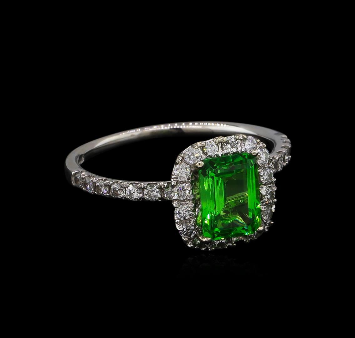 One electronically tested 14KT white gold lady's cast fashion ring with a cathedral halo with a bright polish finish. The featured lady's ring has a shank measuring 1.37 millimeters wide. Identified with markings of "K14". Condition is new, good workmanship. Containing: One prong set emerald step cut natural tsavorite garnet, measuring 7.45 x 5.42 x 3.40mm, approximate weight of 1.31ct., clarity is slightly included, type II, medium dark, moderately strong, slightly yellowish green color, (GIA slyG 6/4), cut is good. Transmitting light with a minimum of distortion, transparent. Colored gemstones are presumed to have been subjected to commonly used enhancement processes. Graded in the setting. Thirty prong set round brilliant cut diamonds, measuring 1.60 - 1.50 x 0.96mm (depth est.) approximate total weight of 30 Stones = 0.43ct. Graded in the setting. Clarity: SI-1 to I-1. Color: G - Good. Total Weight of Colored Stones 1.31ct. Total Weight of Diamonds 0.43ct. Total Weight of Ring 2.40gm. GAS Appraised at $4,810.00.