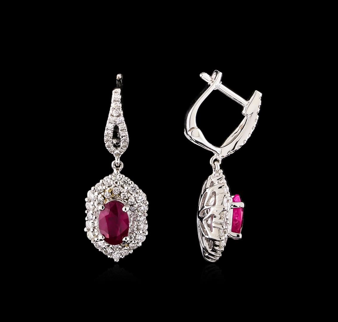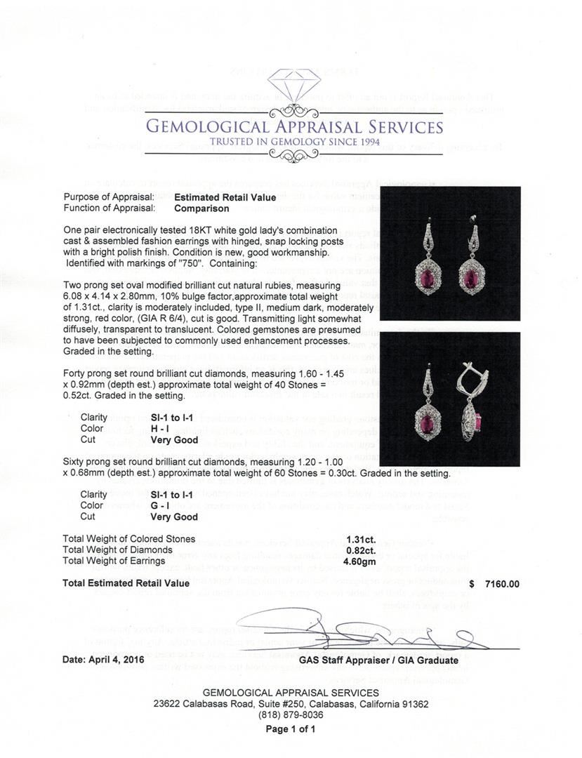 One pair electronically tested 18KT white gold lady's combination cast & assembled fashion earrings with hinged, snap locking posts with a bright polish finish. Identified with markings of "750". Condition is new, good workmanship. Containing: Two prong set oval modified brilliant cut natural rubies, measuring 6.08 x 4.14 x 2.80mm, 10%. bulge factor, approximate total weight of 1.31ct., clarity is moderately included, type II, medium dark, moderately strong, red color, (GIA R 6/4), cut is good. Transmitting light somewhat diffusely, transparent to translucent. Colored gemstones are presumed to have been subjected to commonly used enhancement processes. Graded in the setting. Forty prong set round brilliant cut diamonds, measuring 1.60 - 1.45 x 0.92mm (depth est.) approximate total weight of 40 Stones = 0.52ct. Graded in the setting. Clarity: SI-1 to I-1 . Color: H - I. Cut Very Good Sixty prong set round brilliant cut diamonds, measuring 1.20 - 1.00 x 0.68mm (depth est.) approximate total weight of 60 Stones = 0.30ct. Graded in the setting. Clarity: SI-1 to I-1 . Color: G - I. Cut Very Good. Total Weight of Colored Stones 1.31ct.. Total Weight of Diamonds 0.82ct.. Total Weight of Earrings 4.60gm. GAS Appraised at $7,160.00.