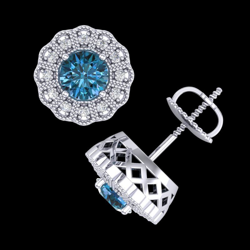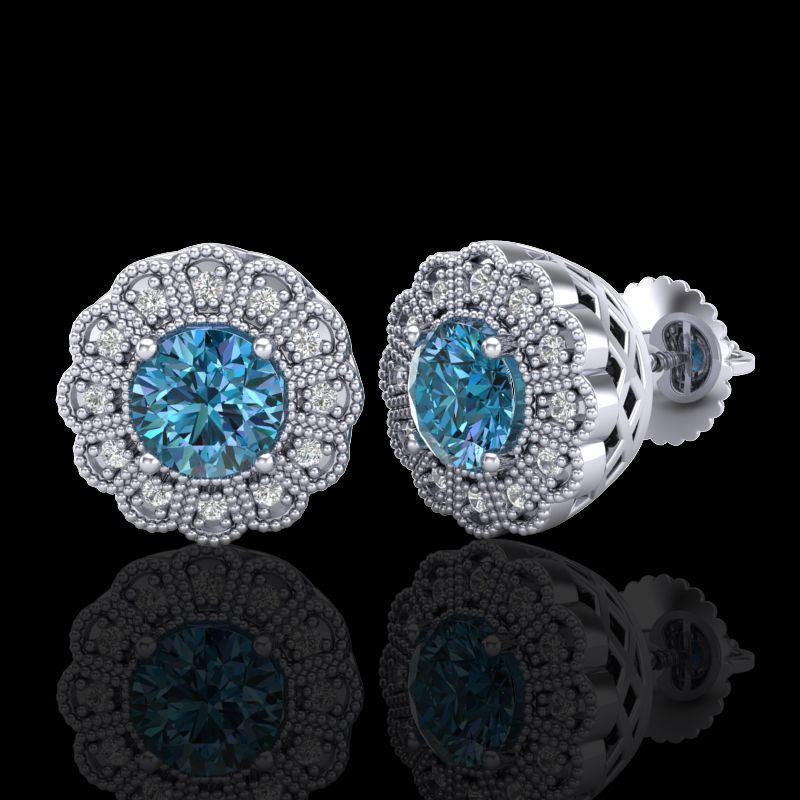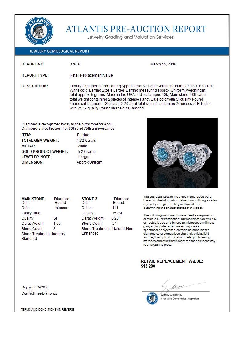 REF-218A2X -37838 ---- 1.32 CTW Fancy Intense Blue Diamond Art Deco Stud Earrings 18K White Gold ---- Luxury Designer Brand Earring Appraised at $13,200 Certificate Number US37838 18k White gold, Earring Size is Larger, Earring measuring approx. Uniform, weighing in total approx. 5 grams. Made in the USA and is stamped 18k, Main stone 1.09 carat total weight containing 2 pieces of Intense Fancy Blue color with SI quality Round shape cut Diamond , Stone #2 0.23 carat total weight containing 24 pieces of H-I color with VS/SI quality Round shape cut Diamond