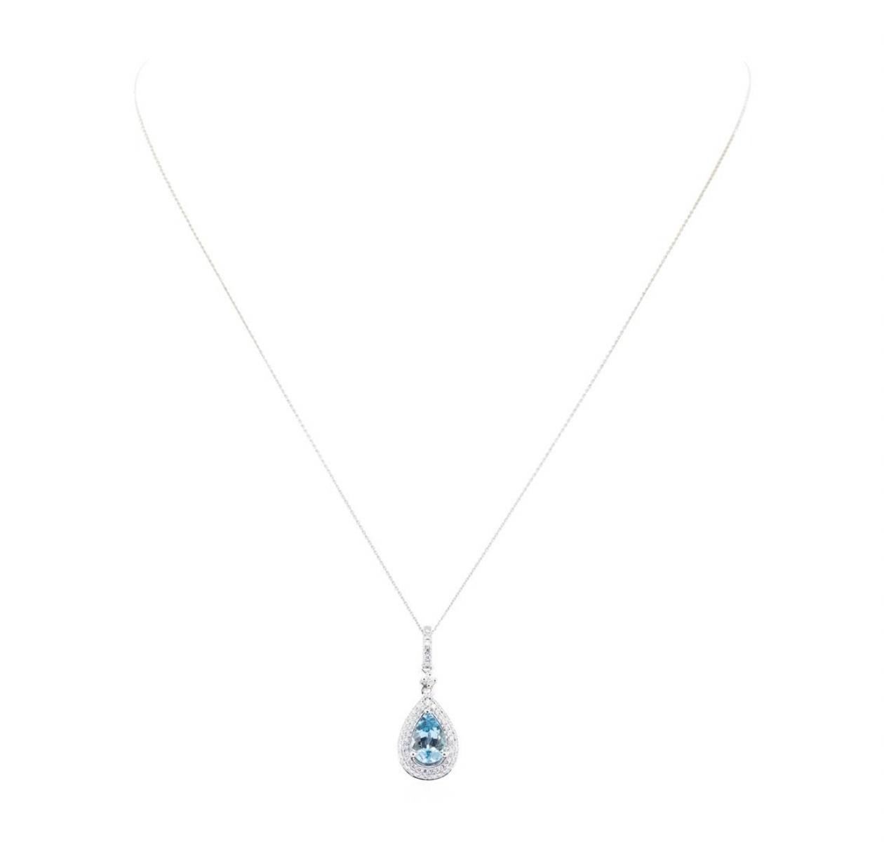 One electronically tested 14KT white gold, aquamarine and diamond set pendant and chain. A pear faceted aquamarine is prong set in a pendant mounting. Approximately sixty-three round brilliant cut diamonds accent the design. The pendant suspends from a curb-link chain that measures sixteen inches in length and secures with a spring ring clasp. Both the pendant and chain tested 14k and have a total combined gross weight of 3.30 grams. Mounting Attributes - Metal: 14KT. Gross Weight: 3.30gm. Construction: Cast. Aquamarine Attributes - Gemstone species: Beryl. Gemstone variety: Aquamarine. Cutting style: Pear faceted. 3 measure: 8.56x6.39x4.45mm. Carat weight: 1.32 carats by formula estimation. Polish: Very good. Symmetry: Very good. Color: Slightly yellowish blue. Saturation of color: Moderate. Tone: Medium. Diamond Accents - Cutting Style: Round brilliant cut. Approximately (63) measure: 1.50mm. Individual carat weight: 0.005-0.007 carats each by formula estimation. Total carat weight: 0.39 carats total weight by formula estimation. General clarity: SI2-I1. Average color: G-H. Estimated retail value $1,850.00 US.