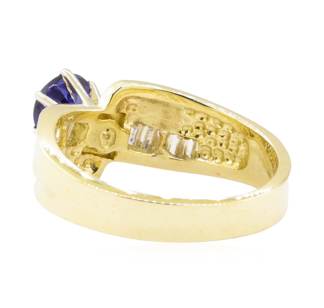 One ring featuring: 14KT yellow gold weighing 4.6 grams containing one blue sapphire weighing 0.92ctw and baguette cut diamonds weighing 0.40ctw.