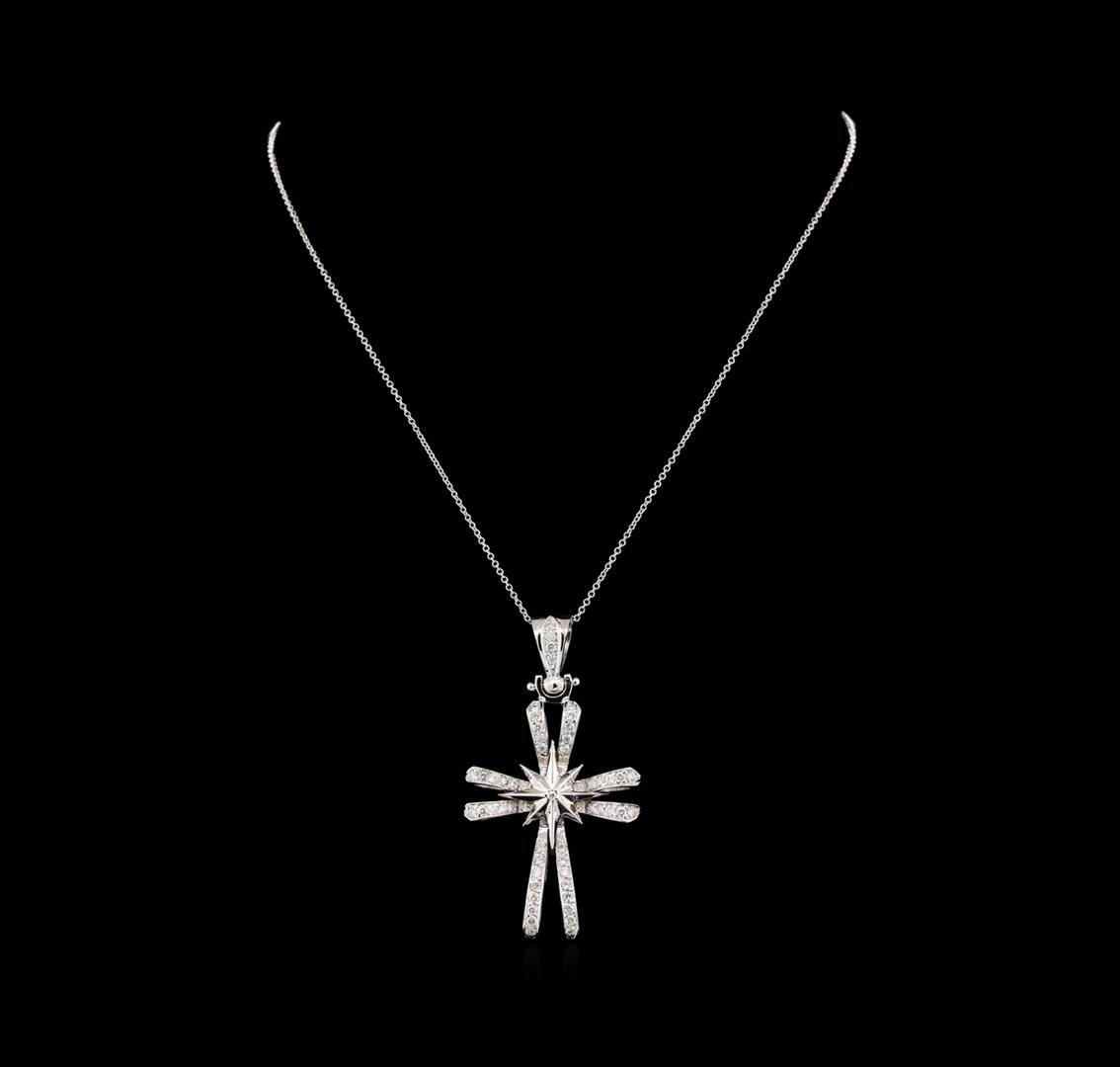 One electronically tested 14KT white gold cast & assembled diamond cross pendant with chain. Two and one-quarter inch length pendant features a stylized double diamond ribbon cross with a center eight-ray star, completed by a stylized diamond set bail. The pendant is supported by a sixteen inch length 14KT white gold cable chain, terminating in a lobster claw clasp. Bright polish finish with milgrain detailing. Identified with markings of "14K". Condition is new, good workmanship. Containing: Fifty-One prong & bezel set round brilliant cut diamonds, measuring 2.00 - 1.80 x 1.14mm (depth est.) approximate total weight of 51 Stones = 1.32ct. Graded in the setting. Clarity: SI-1 to I-1. Color: G - I. Total Weight of Diamonds 1.32ct. Total Weight of Pendant With Chain 24.19gm. AIG Appraised at $7,815.00.