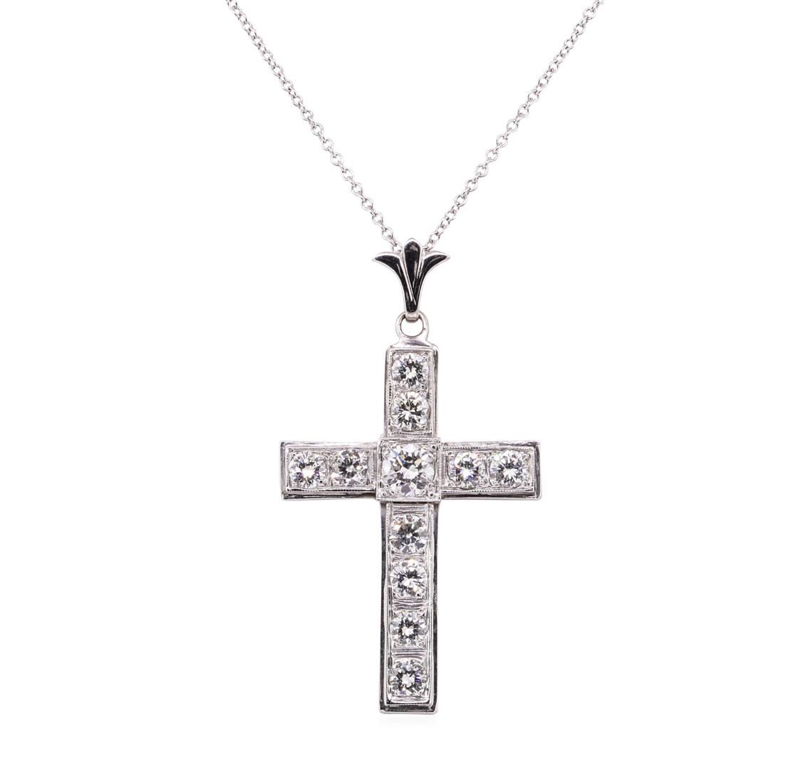 One electronically tested 14KT white gold lady's combination cast & assembled fashion cross pendant and chain 18.0' long, 1.1mm round cable link with a spring ring clasp with a bright polish finish. Identified with markings of '14K'. Condition is like new, good workmanship. Containing: One prong set round brilliant cut diamond, measuring 4.45 - 4.38 x 2.64mm (depth est.) approximate weight of 0.32ct. Graded in the setting. Color H Clarity VS-2 Cut Good Ten prong set round brilliant cut diamonds, measuring 3.10 - 2.90 x 1.80mm (depth est.) approximate total weight of 10 Stones = 1.00ct. Graded in the setting. Color H - J Clarity SI-1 to SI-3 Cut Good. Total Weight of Diamonds 1.32ct.. Total Weight of Pendant And Chain 4.70gm GAS Appraised at $4545.00. GAS Appraised.