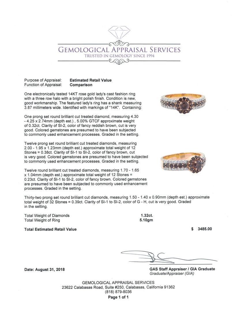 One electronically tested 14KT rose gold lady's cast fashion ring with a three row halo with a bright polish finish. The featured lady's ring has a shank measuring 3.87 millimeters wide. Identified with markings of '14K'. Condition is new, good workmanship. Containing: One prong set round brilliant cut treated diamond, measuring 4.30 - 4.25 x 2.74mm (depth est.) , 5.00.%. GTCF approximate weight of 0.32ct. Colored gemstones are presumed to have been subjected to commonly used enhancement processes. Graded in the setting. Color Fancy Reddish Brown Clarity SI-2 Cut Very Good Twelve prong set round brilliant cut treated diamonds, measuring 2.00 - 1.95 x 1.23mm (depth est.) approximate total weight of 12 Stones = 0.38ct. Colored gemstones are presumed to have been subjected to commonly used enhancement processes. Graded in the setting. Color Fancy Brown Clarity SI-1 to SI-2 Cut Very Good Twelve round brilliant cut treated diamonds, measuring 1.70 - 1.65 x 1.04mm (depth est.) approximate total weight of 12 Stones = 0.23ct. Colored gemstones are presumed to have been subjected to commonly used enhancement processes. Graded in the setting. Color Fancy Brown Clarity SI-1 to SI-2 Thirty-Two prong set round brilliant cut diamonds, measuring 1.50 - 1.40 x 0.90mm (depth est.) approximate total weight of 32 Stones = 0.39ct. Graded in the setting. Color G - H Clarity SI-1 to SI-2 Cut Very Good. Total Weight of Diamonds 1.32ct.. Total Weight of Ring 5.10gm GAS Appraised at $3485.00. GAS Appraised at $3,485.00.
