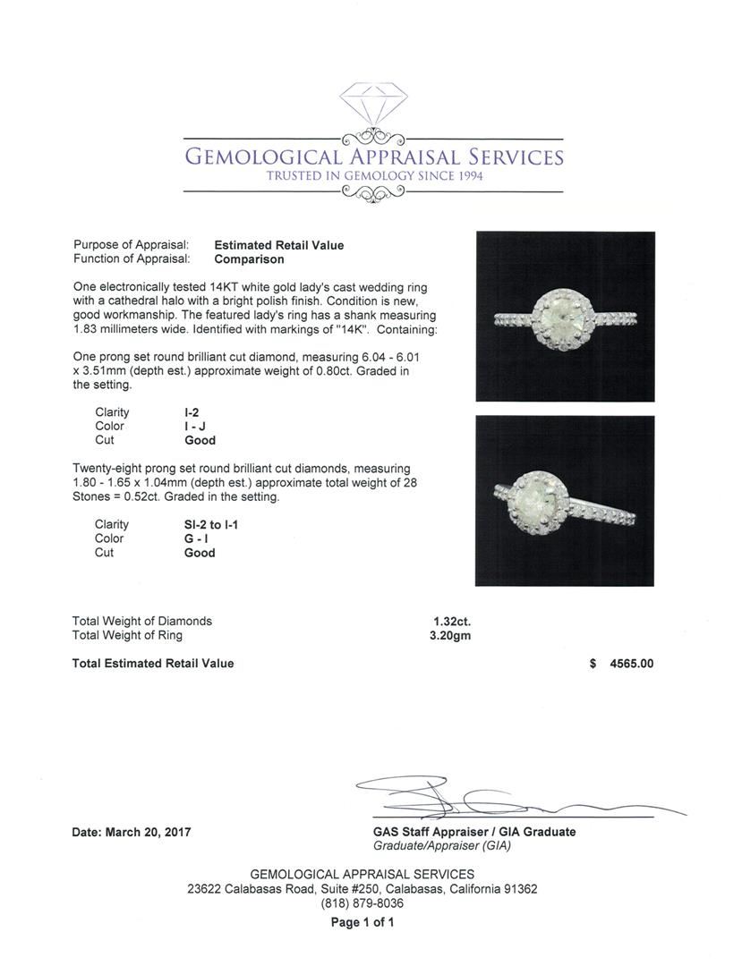 One electronically tested 14KT white gold lady's cast wedding ring with a cathedral halo with a bright polish finish. The featured lady's ring has a shank measuring 1.83 millimeters wide. Identified with markings of '14K'. Condition is new, good workmanship. Containing: One prong set round brilliant cut diamond, measuring 6.04 - 6.01 x 3.51mm (depth est.) approximate weight of 0.80ct. Graded in the setting. Color I - J Clarity I-2 Cut Good Twenty-Eight prong set round brilliant cut diamonds, measuring 1.80 - 1.65 x 1.04mm (depth est.) approximate total weight of 28 Stones = 0.52ct. Graded in the setting. Color G - I Clarity SI-2 to I-1 Cut Good. Total Weight of Diamonds 1.32ct.. Total Weight of Ring 3.20gm GAS Appraised at $4,565.00.