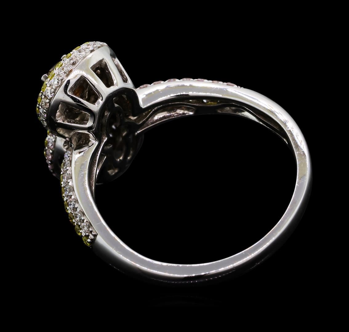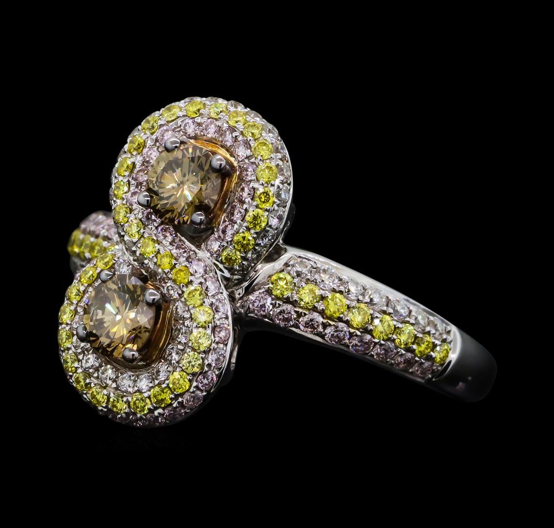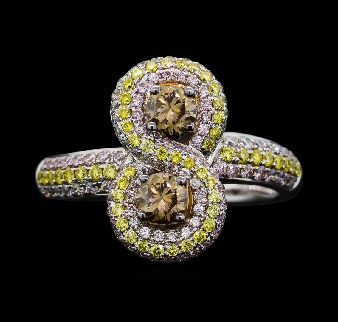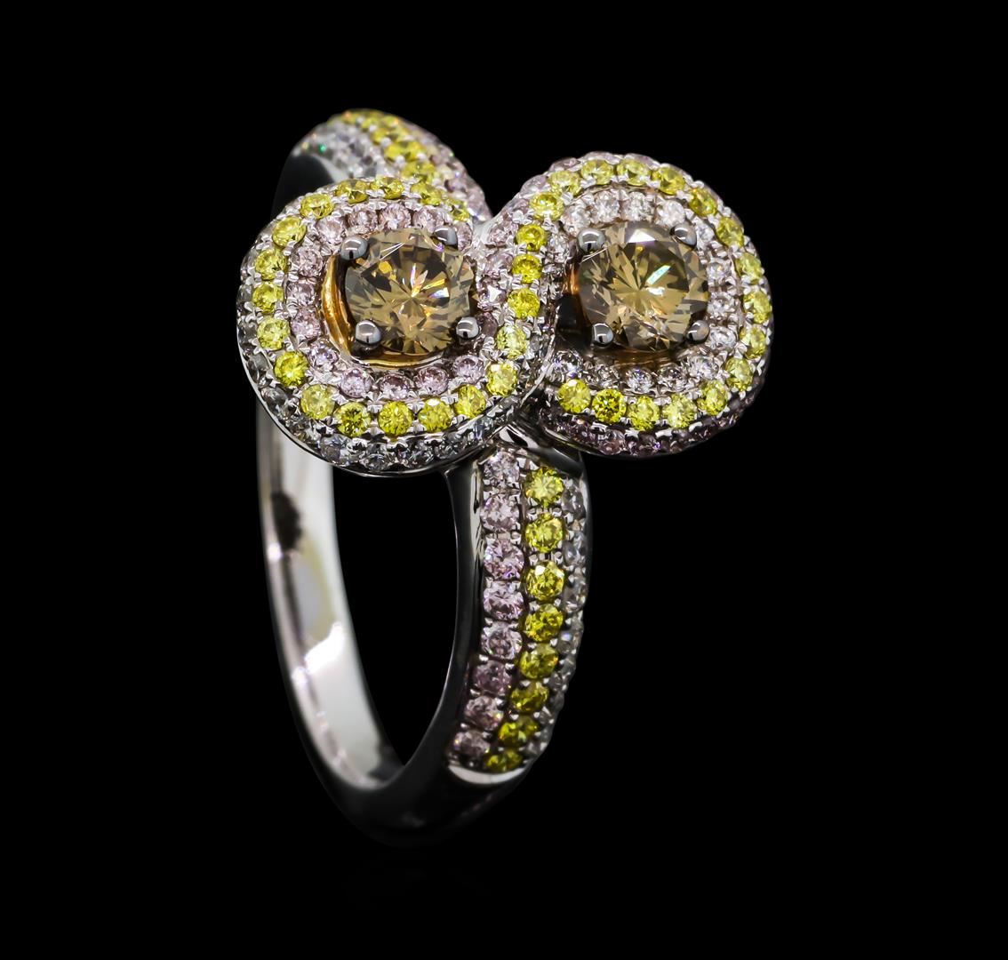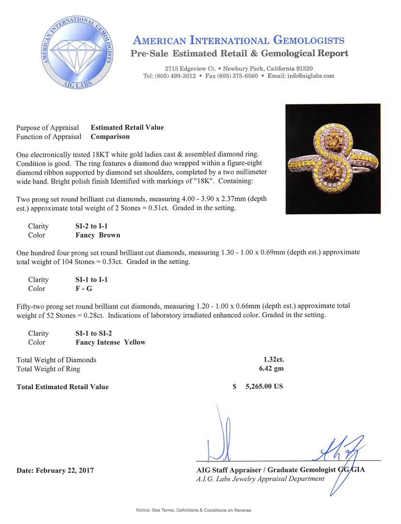 One electronically tested 18KT white gold ladies cast & assembled diamond ring. The ring features a diamond duo wrapped within a figure-eight diamond ribbon supported by diamond set shoulders, completed by a two millimeter wide band. Bright polish finish Identified with markings of '18K'. Condition is good. Containing: Two prong set round brilliant cut diamonds, measuring 4.00 - 3.90 x 2.37mm (depth est.) approximate total weight of 2 Stones = 0.51ct. Graded in the setting. Clarity SI-2 to I-1 One Hundred Four prong set round brilliant cut diamonds, measuring 1.30 - 1.00 x 0.69mm (depth est.) approximate total weight of 104 Stones = 0.53ct. Graded in the setting. Clarity SI-1 to I-1. Color: F - G Fifty-Two prong set round brilliant cut diamonds, measuring 1.20 - 1.00 x 0.66mm (depth est.) approximate total weight of 52 Stones = 0.28ct. Indications of laboratory irradiated enhanced color. Graded in the setting. Clarity SI-1 to SI-2. Total Weight of Diamonds 1.32ct.. Total Weight of Ring 6.42gm. AIG Appraised at $5,265.00.