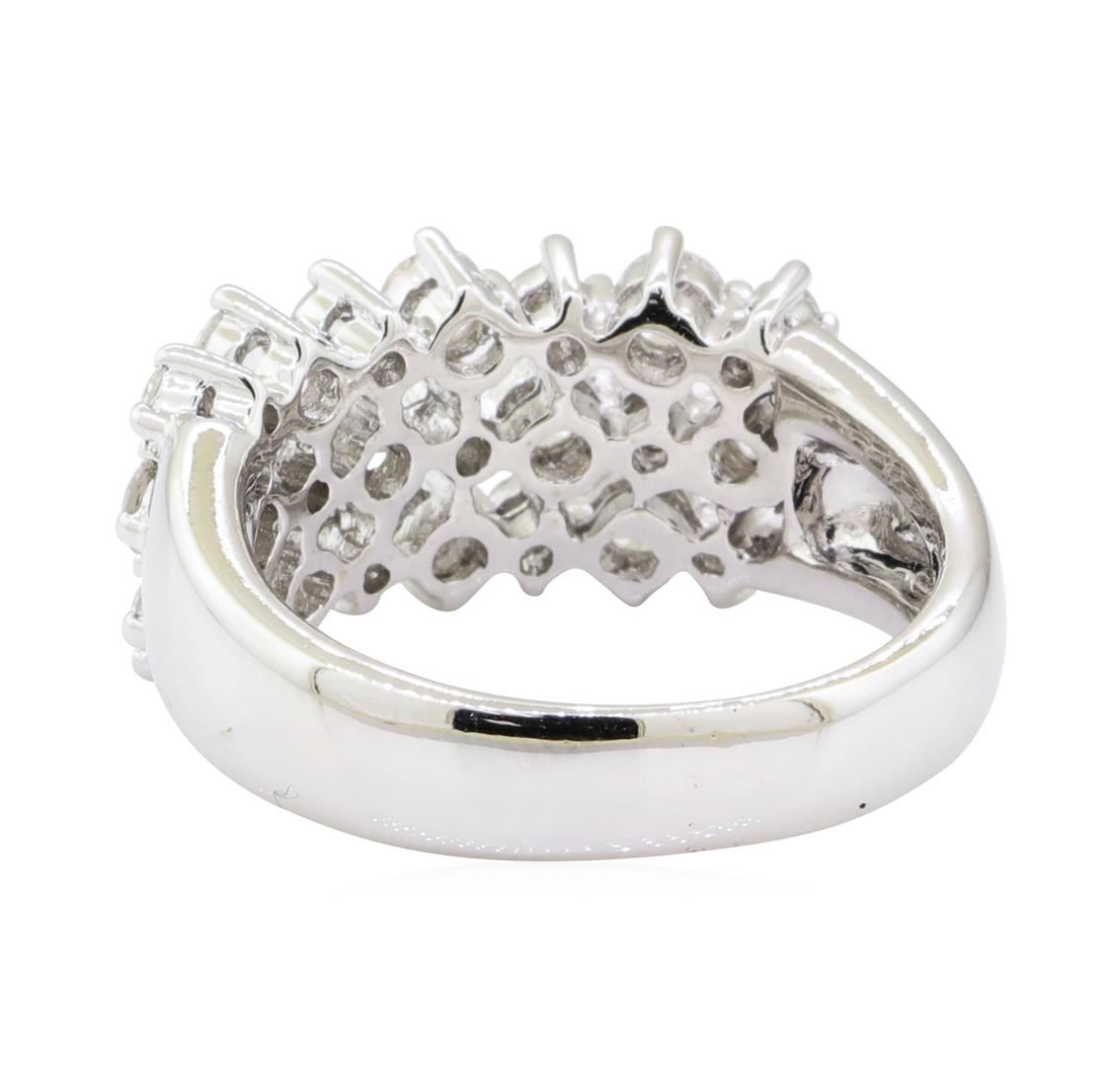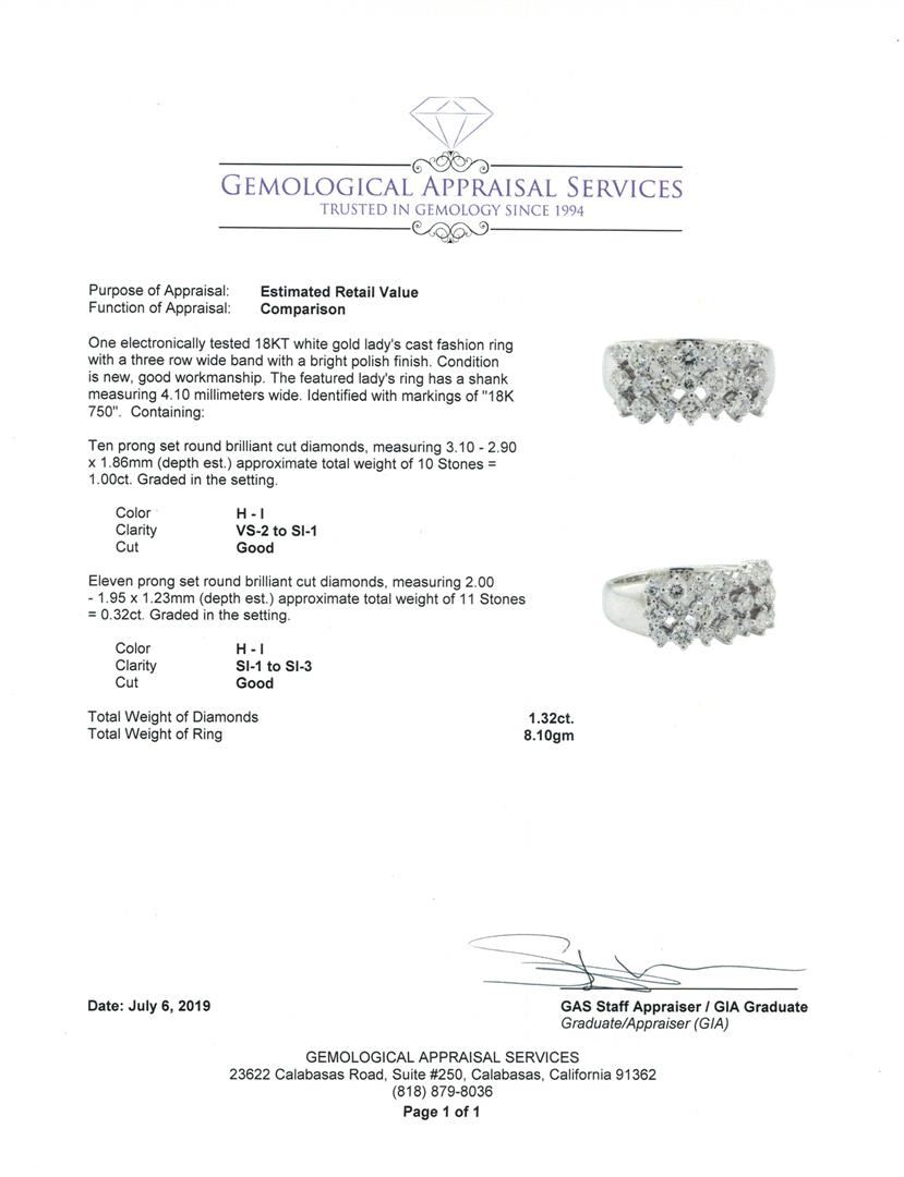 One electronically tested 18KT white gold lady's cast fashion ring with a three row wide band with a bright polish finish. The featured lady's ring has a shank measuring 4.10 millimeters wide. Identified with markings of '18K 750'. Condition is new, good workmanship. Containing: Ten prong set round brilliant cut diamonds, measuring 3.10 - 2.90 x 1.86mm (depth est.) approximate total weight of 10 Stones = 1.00ct. Graded in the setting. Color H - I Clarity VS-2 to SI-1 Cut Good Eleven prong set round brilliant cut diamonds, measuring 2.00 - 1.95 x 1.23mm (depth est.) approximate total weight of 11 Stones = 0.32ct. Graded in the setting. Color H - I Clarity SI-1 to SI-3 Cut Good. Total Weight of Diamonds 1.32ct.. Total Weight of Ring 8.10gm GAS Appraised at $4800.00. GAS Appraised at $4,800.00.