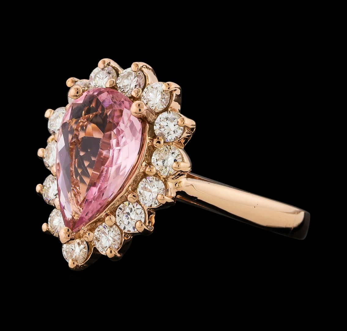 One Pink Tourmaline and Diamond Ring featuring: 14KT Rose Gold with a total weight of 4.25 grams, Pink Tourmaline with a total weight of 1.32ct, and 14 diamonds with a total weight of 0.66ctw.
