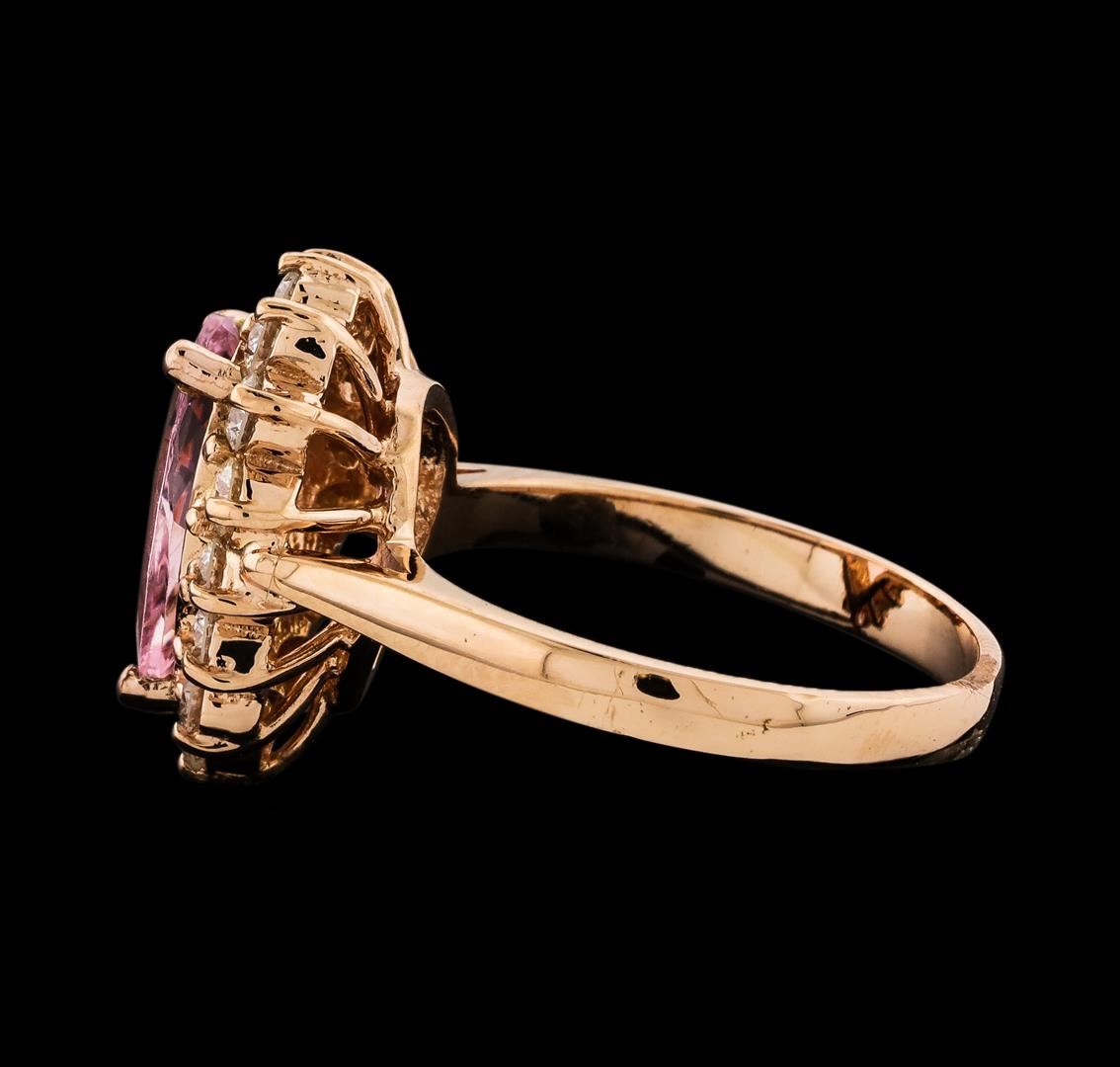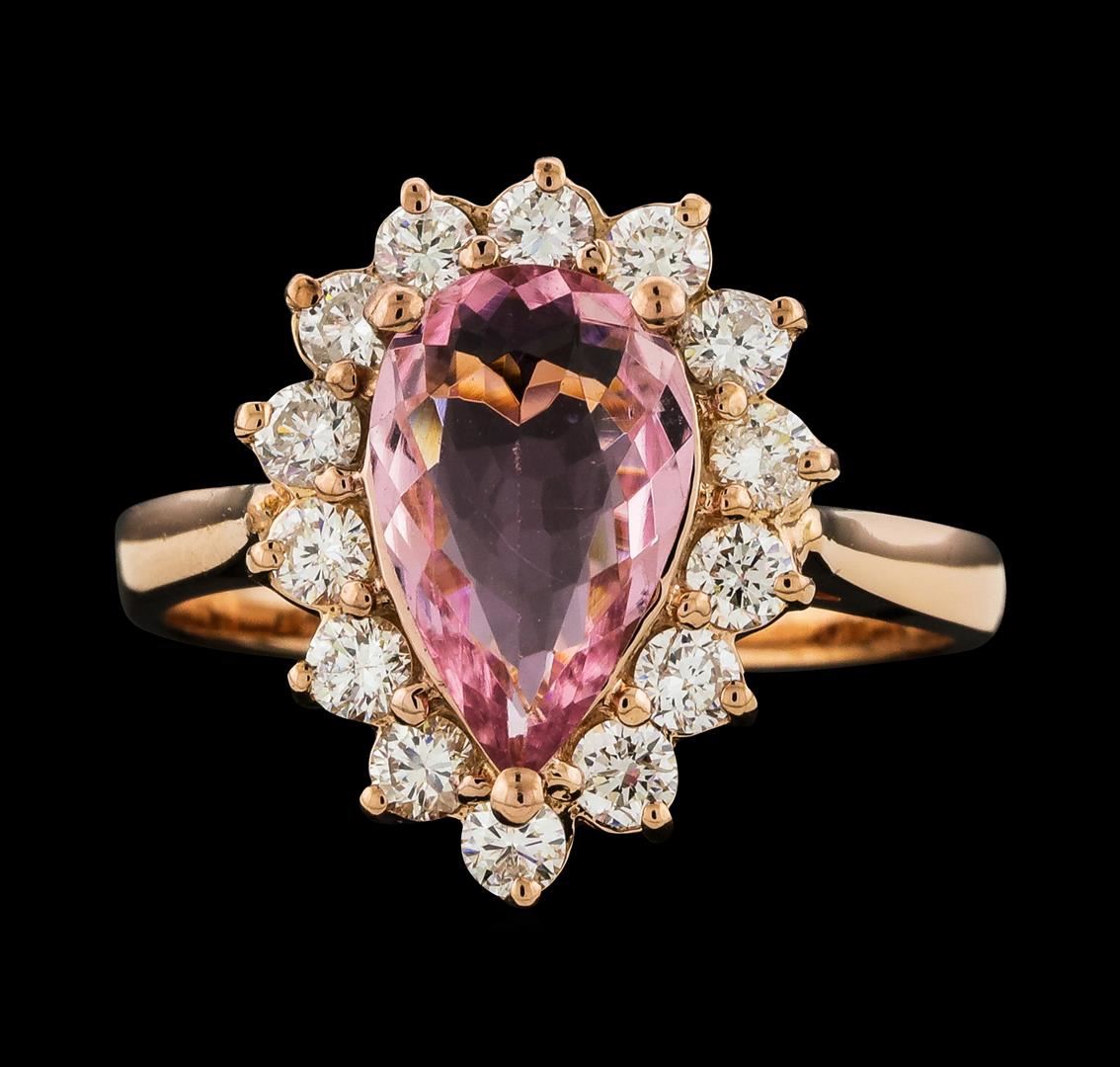 One Pink Tourmaline and Diamond Ring featuring: 14KT Rose Gold with a total weight of 4.25 grams, Pink Tourmaline with a total weight of 1.32ct, and 14 diamonds with a total weight of 0.66ctw.