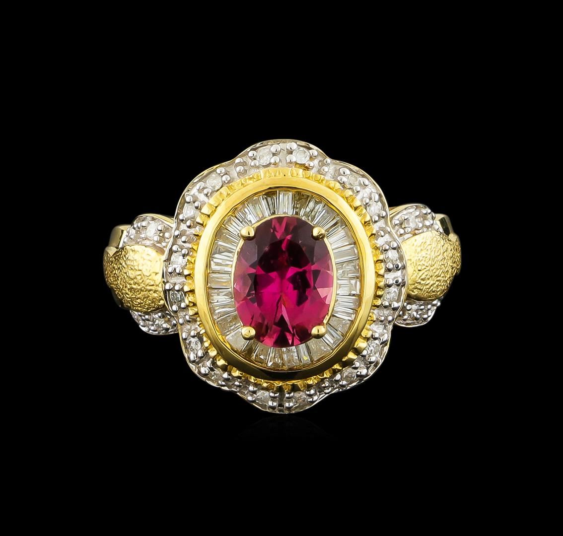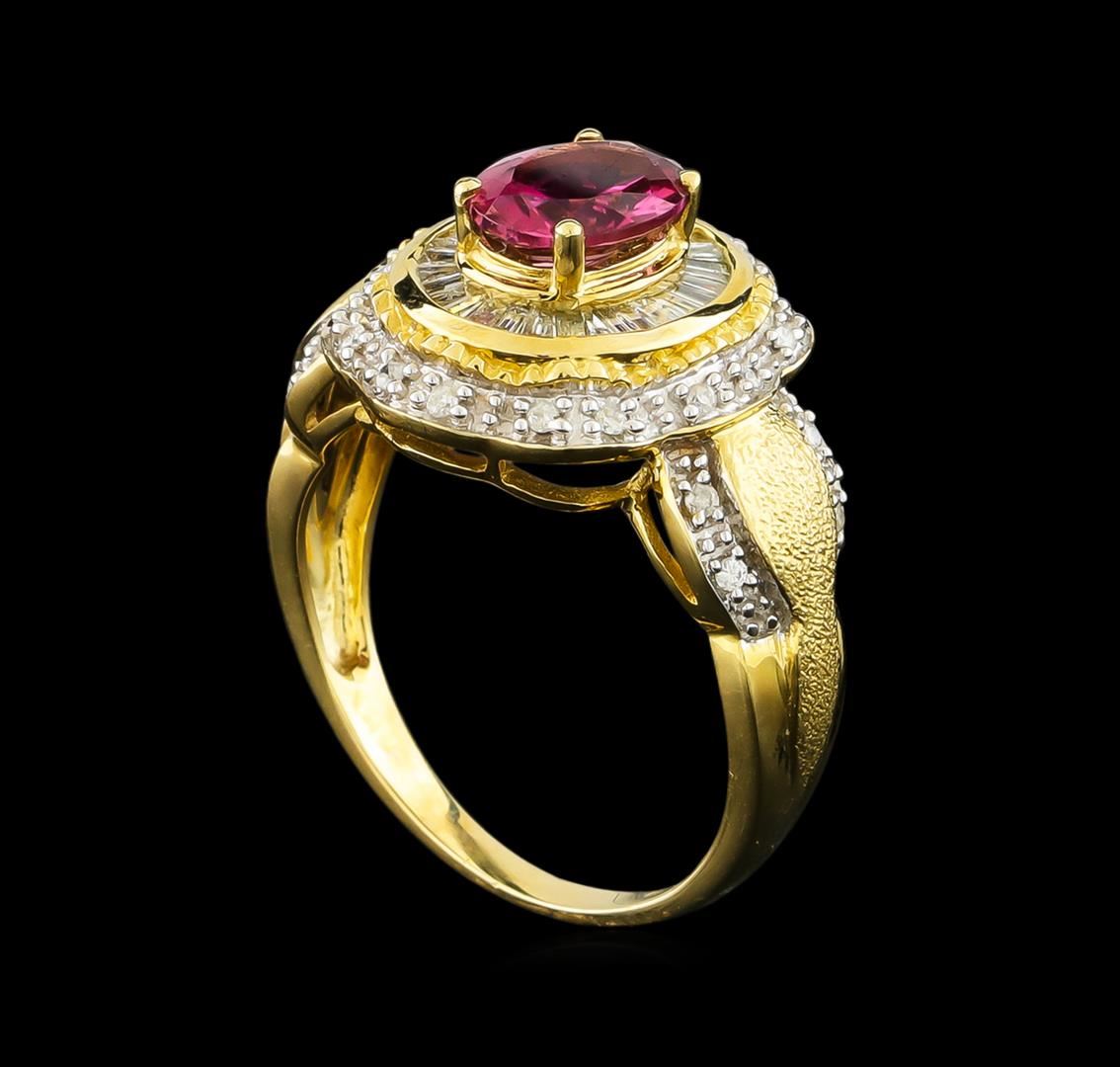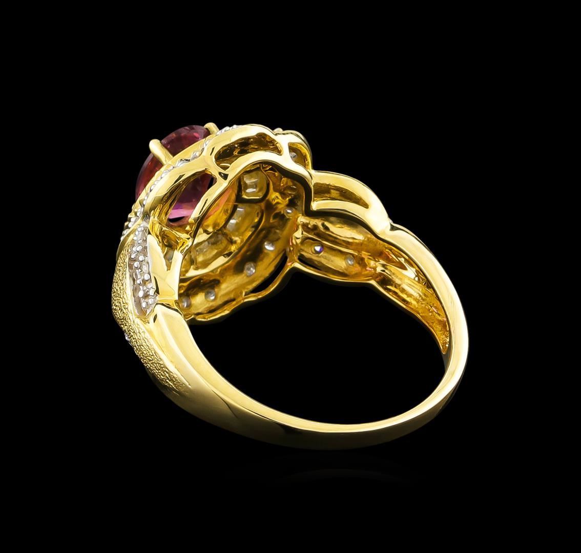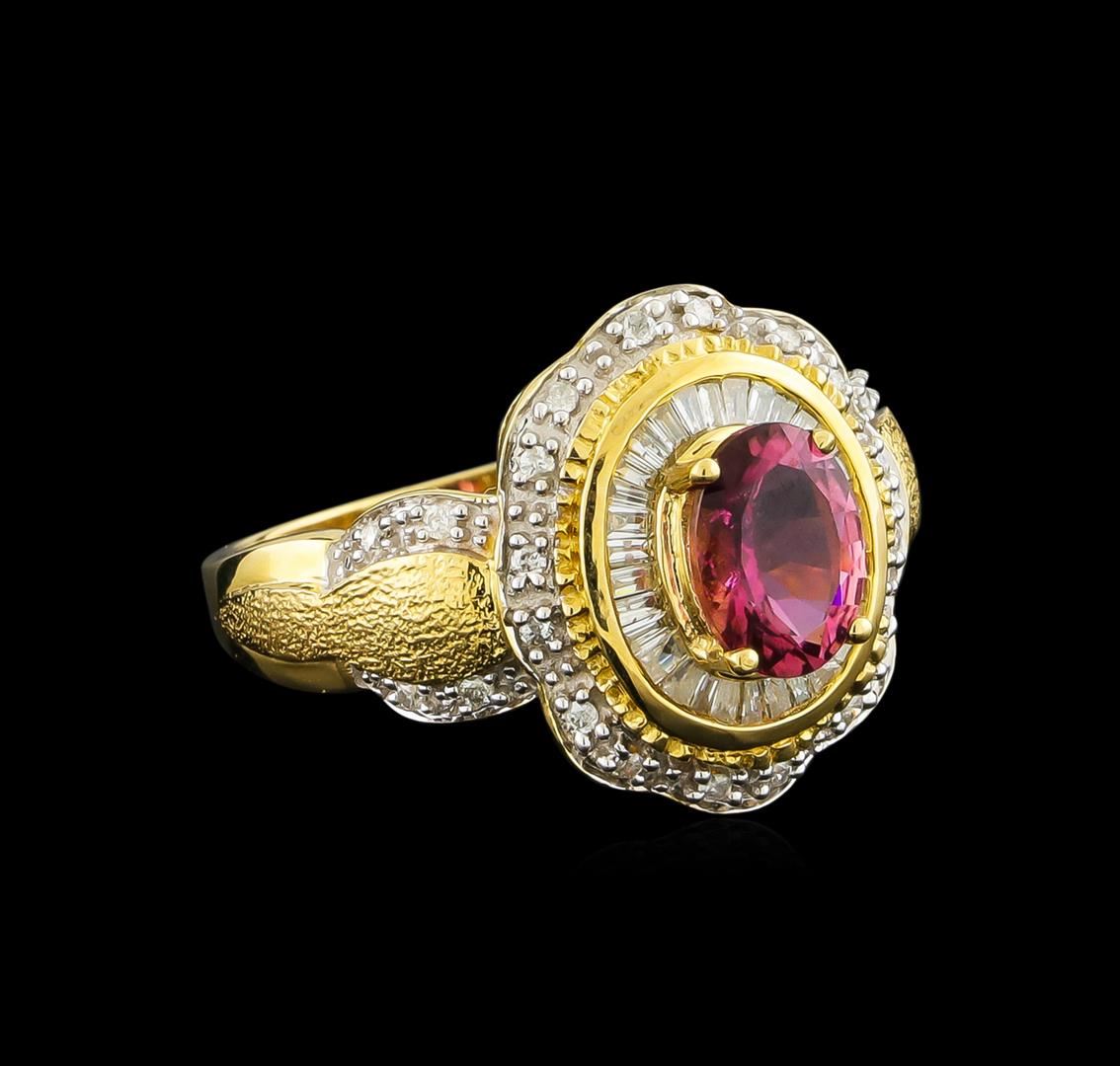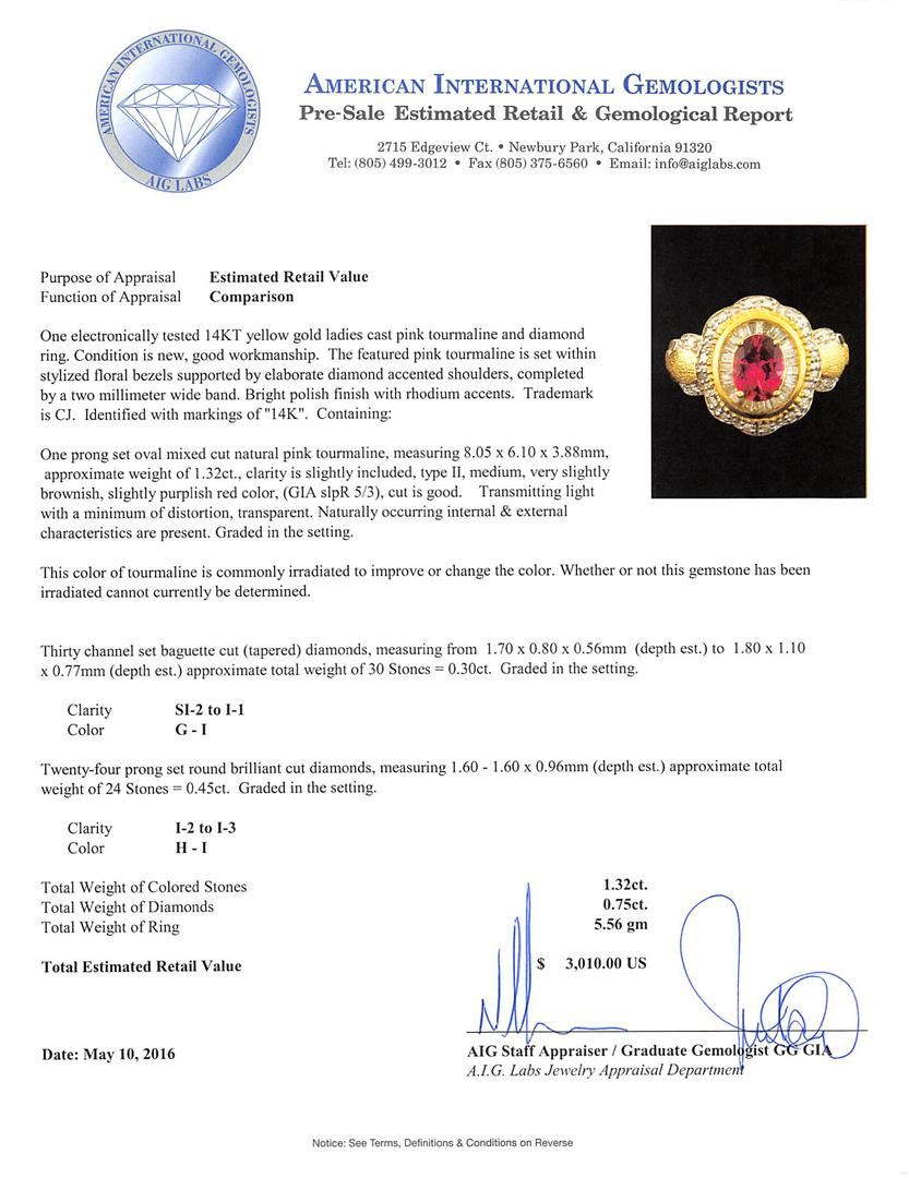 One electronically tested 14KT yellow gold ladies cast pink tourmaline and diamond ring. The featured pink tourmaline is set within stylized floral bezels supported by elaborate diamond accented shoulders, completed by a two millimeter wide band. Bright polish finish with rhodium accents. Trademark is CJ. Identified with markings of "14K". Condition is new, good workmanship. Containing: One prong set oval mixed cut natural pink tourmaline, measuring 8.05 x 6.10 x 3.88mm, approximate weight of 1.32ct., clarity is slightly included, type II, medium, very slightly brownish, slightly purplish red color, (GIA slpR 5/3), cut is good. Transmitting light with a minimum of distortion, transparent. Naturally occurring internal & external characteristics are present. Graded in the setting. This color of tourmaline is commonly irradiated to improve or change the color. Whether or not this gemstone has been irradiated cannot currently be determined. Thirty channel set baguette cut (tapered) diamonds, measuring from 1.70 x 0.80 x 0.56mm (depth est.) to 1.80 x 1.10 x 0.77mm (depth est.) approximate total weight of 30 Stones = 0.30ct. Graded in the setting. Clarity: SI-2 to I-1. Color: G - I Twenty-Four prong set round brilliant cut diamonds, measuring 1.60 - 1.60 x 0.96mm (depth est.) approximate total weight of 24 Stones = 0.45ct. Graded in the setting. Clarity: I-2 to I-3. Color: H - I. Total Weight of Colored Stones 1.32ct. Total Weight of Diamonds 0.75ct. Total Weight of Ring 5.56gm. AIG Appraised at $3,010.00.