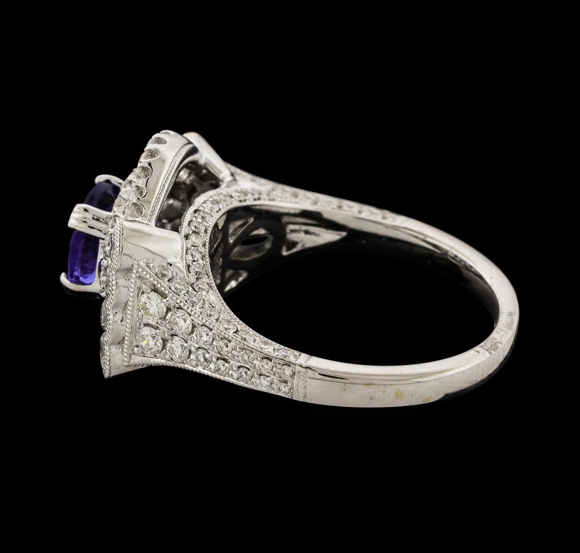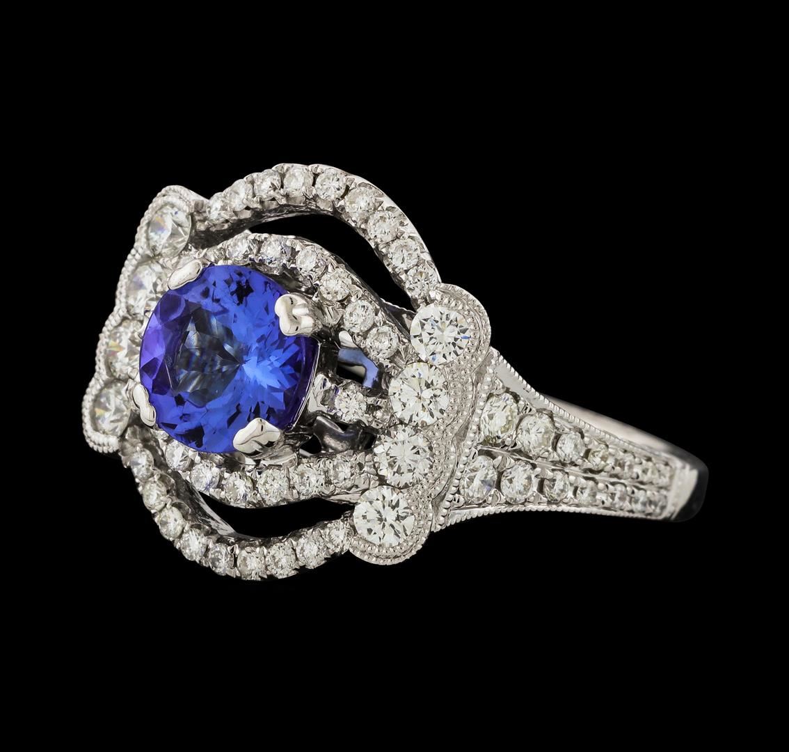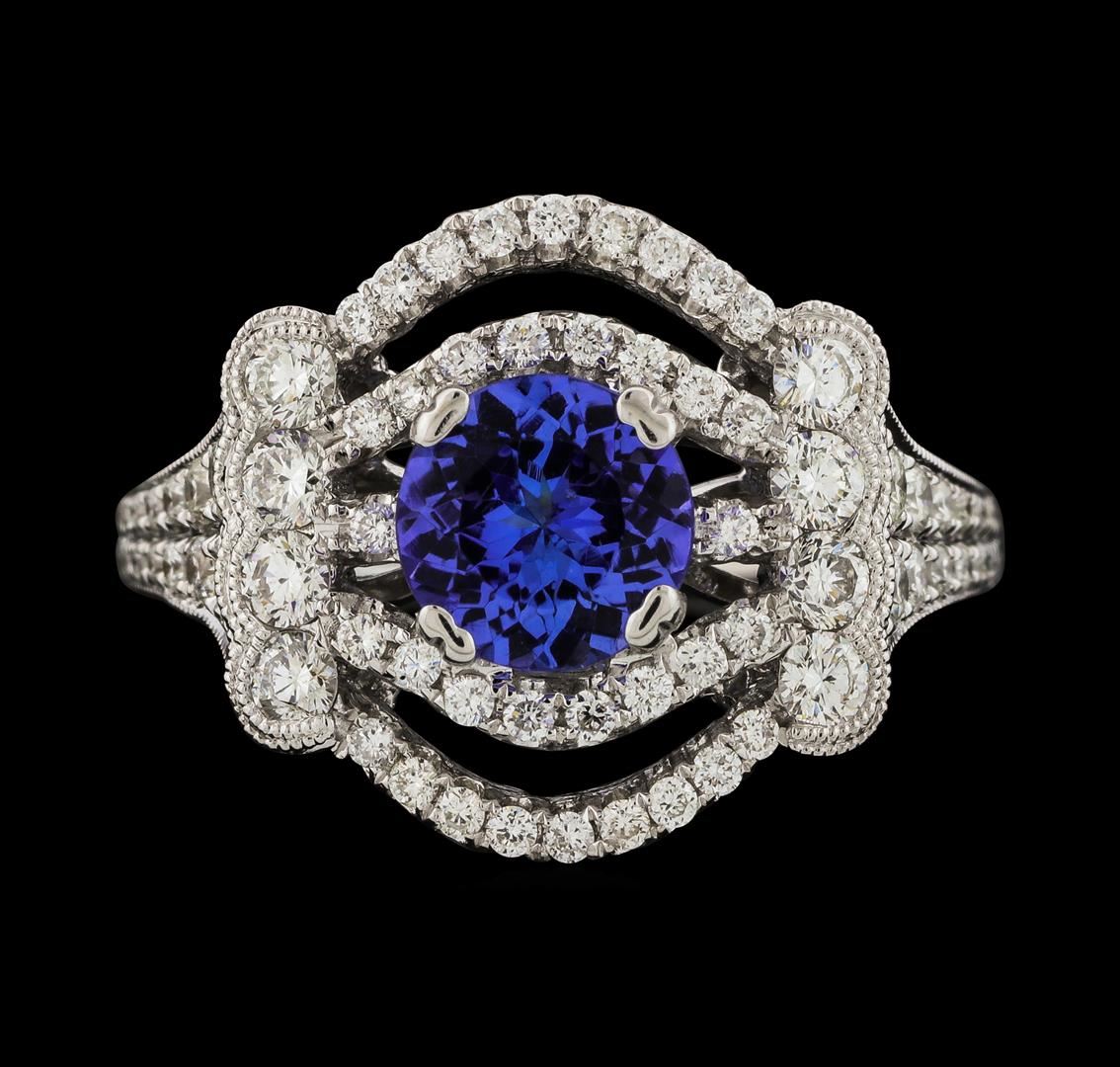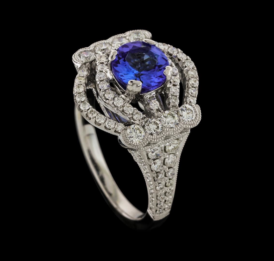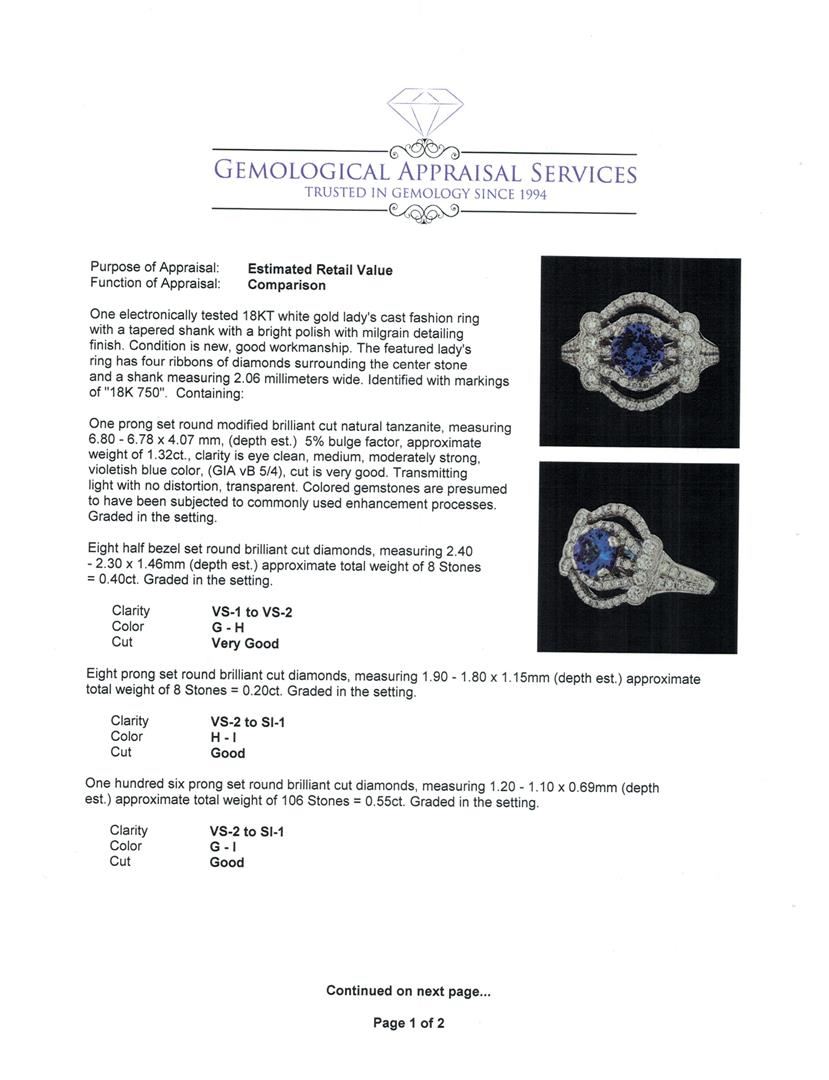 One electronically tested 18KT white gold lady's cast fashion ring with a tapered shank with a bright polish with milgrain detailing finish. The featured lady's ring has four ribbons of diamonds surrounding the center stone and a shank measuring 2.06 millimeters wide. Identified with markings of '18K 750'. Condition is new, good workmanship. Containing: One prong set round modified brilliant cut natural tanzanite, measuring 6.80 - 6.78 x 4.07 mm, (depth est.) 5%. bulge factor, approximate weight of 1.32ct., clarity is eye clean, medium, moderately strong, violetish blue color, (GIA vB 5/4), cut is very good. Transmitting light with no distortion, transparent. Colored gemstones are presumed to have been subjected to commonly used enhancement processes. Graded in the setting. Eight half bezel set round brilliant cut diamonds, measuring 2.40 - 2.30 x 1.46mm (depth est.) approximate total weight of 8 Stones = 0.40ct. Graded in the setting. Clarity VS-1 to VS-2. Color: G - H Cut Very Good Eight prong set round brilliant cut diamonds, measuring 1.90 - 1.80 x 1.15mm (depth est.) approximate total weight of 8 Stones = 0.20ct. Graded in the setting. Clarity VS-2 to SI-1. Color: H - I Cut Good One Hundred Six prong set round brilliant cut diamonds, measuring 1.20 - 1.10 x 0.69mm (depth est.) approximate total weight of 106 Stones = 0.55ct. Graded in the setting. Clarity VS-2 to SI-1. Color: G - I Cut Good. Total Weight of Colored Stones 1.32ct.. Total Weight of Diamonds 1.15ct.. Total Weight of Ring 7.70gm. GAS Appraised at $7,270.00.