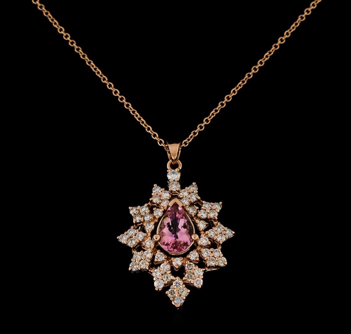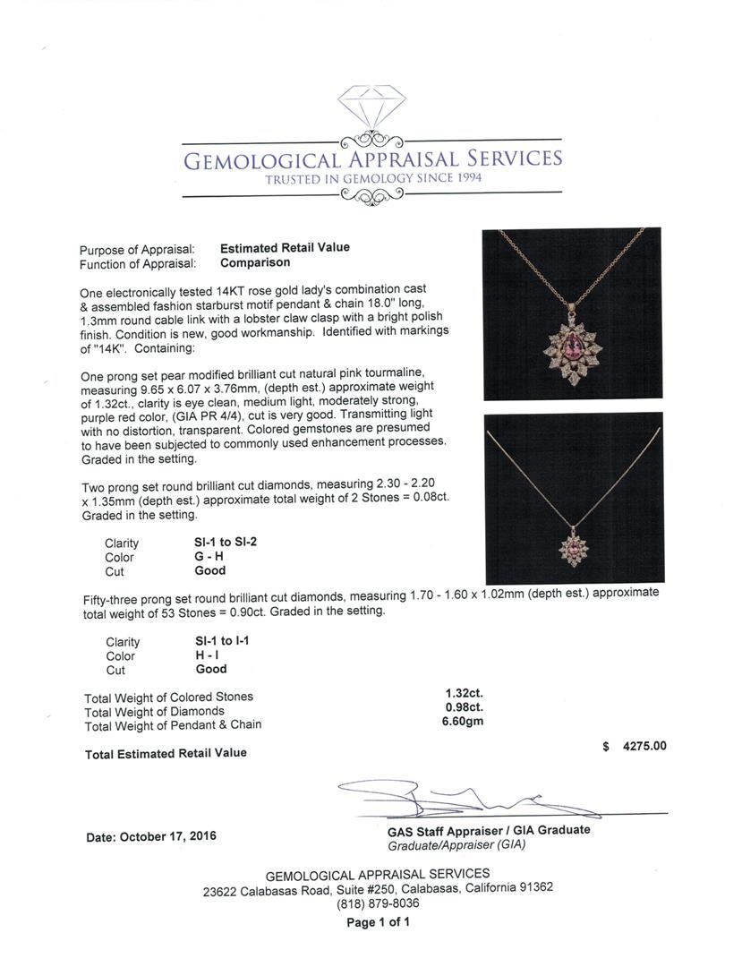 One electronically tested 14KT rose gold lady's combination cast & assembled fashion starburst motif pendant & chain 18.0' long, 1.3mm round cable link with a lobster claw clasp with a bright polish finish. Identified with markings of '14K'. Condition is new, good workmanship. Containing: One prong set pear modified brilliant cut natural pink tourmaline, measuring 9.65 x 6.07 x 3.76mm, (depth est.) approximate weight of 1.32ct., clarity is eye clean, medium light, moderately strong, purple red color, (GIA PR 4/4), cut is very good. Transmitting light with no distortion, transparent. Colored gemstones are presumed to have been subjected to commonly used enhancement processes. Graded in the setting. Two prong set round brilliant cut diamonds, measuring 2.30 - 2.20 x 1.35mm (depth est.) approximate total weight of 2 Stones = 0.08ct. Graded in the setting. Clarity SI-1 to SI-2. Color: G - H Cut Good Fifty-Three prong set round brilliant cut diamonds, measuring 1.70 - 1.60 x 1.02mm (depth est.) approximate total weight of 53 Stones = 0.90ct. Graded in the setting. Clarity SI-1 to I-1. Color: H - I Cut Good. Total Weight of Colored Stones 1.32ct.. Total Weight of Diamonds 0.98ct.. Total Weight of Pendant & Chain 6.60gm. GAS Appraised at $4,275.00.