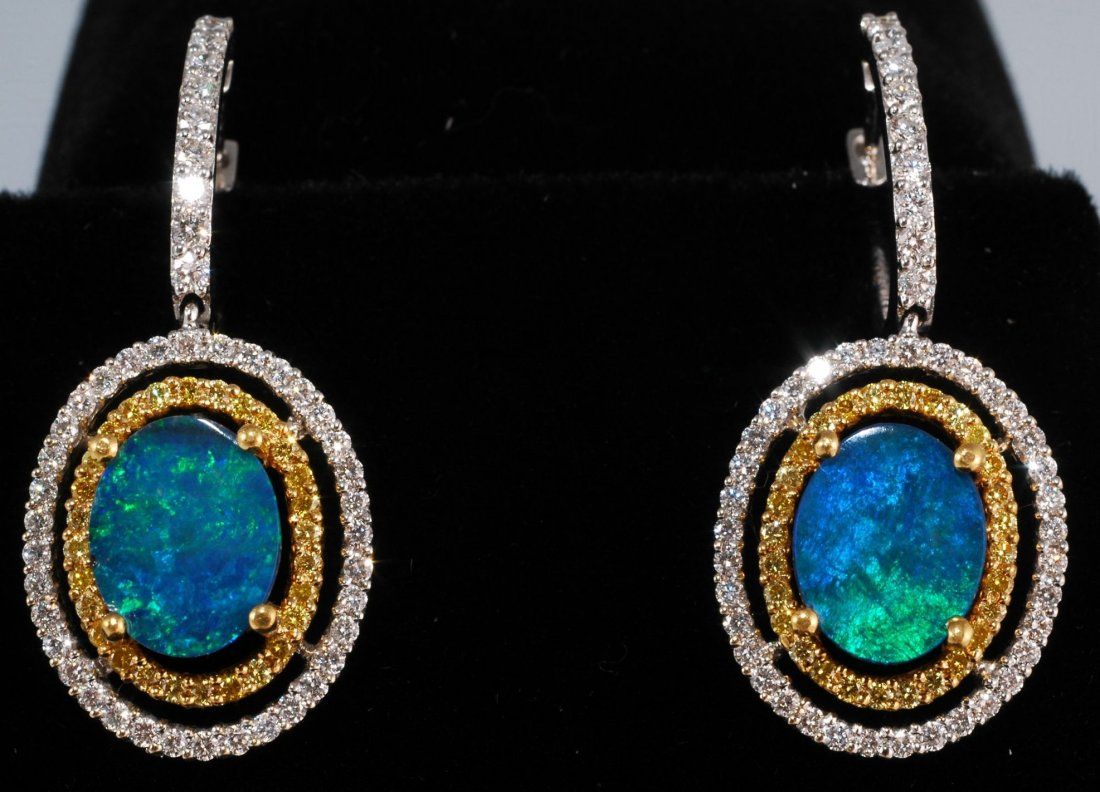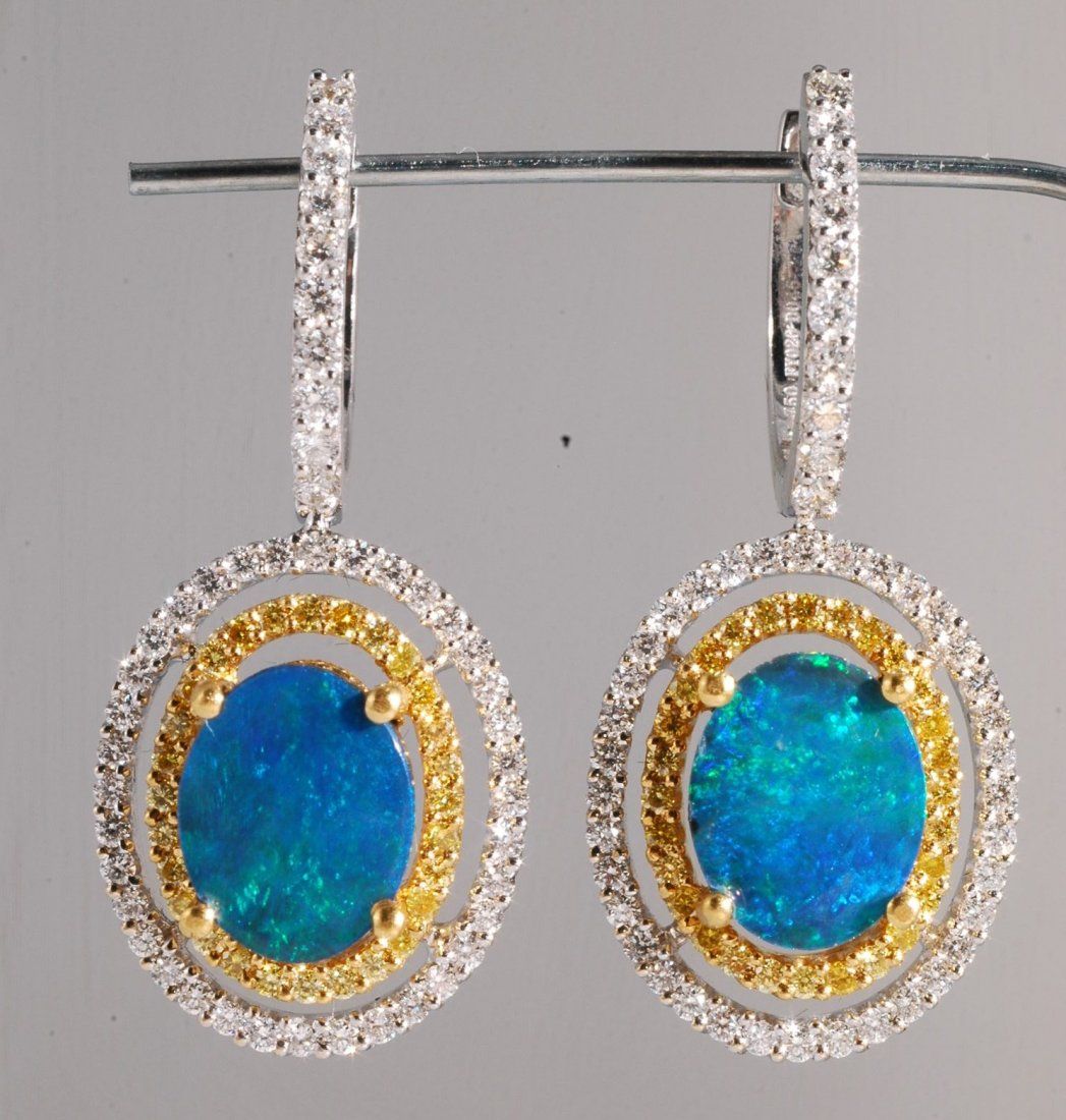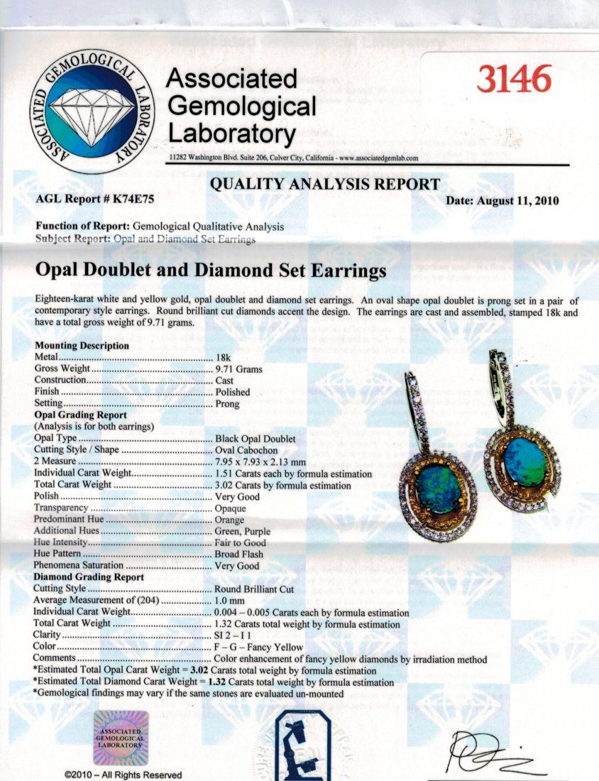 Opal doublet (3.02 carats) and diamond (1.32 carats) set earrings. An oval shape opal doublet is prong set in a pair of contemporary style earrings. Round brilliant cut diamonds accent the design. The earrings are cast and assembled, stamped 18K white and yellow gold, and have a total gross weight of 9.71 grams.