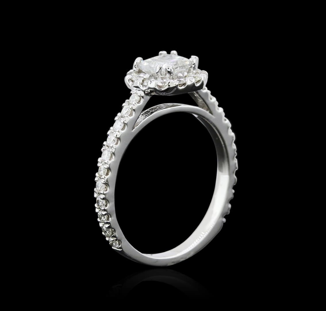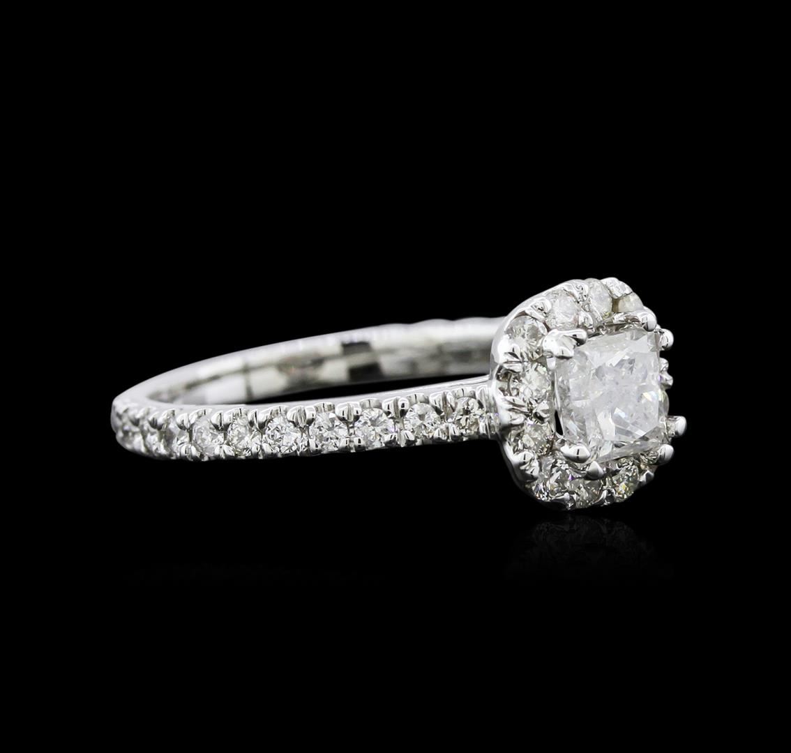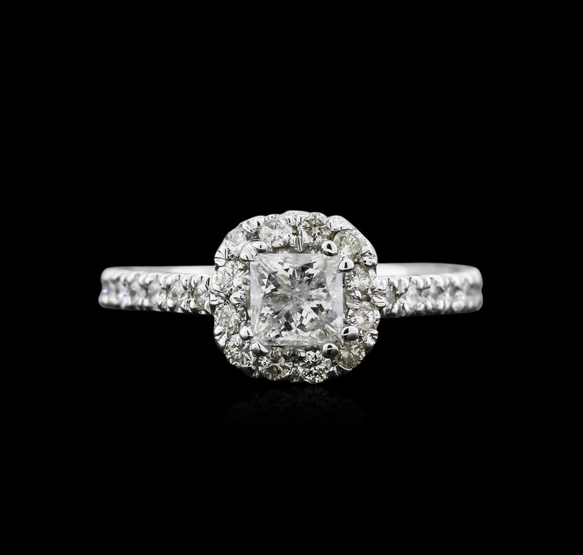 One electronically tested 14KT white gold ladies cast diamond unity ring with a bright polish finish. The featured diamond is set within a diamond bezel supported by diamond set shoulders, completed by a one and one-half millimeter wide band. Identified with markings of "14K". Condition is new, good workmanship. Containing: One prong set princess cut diamond, measuring 4.65 x 4.60 x 3.70mm (depth est.) approximate weight of 0.75ct. Graded in the setting. Clarity I-1 Color I. Depth 80.4%. Table 76.1%. Thirty-Four prong set round brilliant cut diamonds approximate total weight of 34 Stones = 0.57ct. Graded in the setting. Clarity SI-2 to I-1 Color H - J. Total Weight of Diamonds 1.32ct. Total Weight of Ring 3.17 grams. AIG Appraised at $5,885.00.